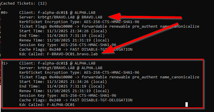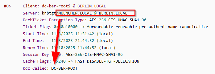 @mzahneissen das ist meine Testumgebung. Ich hatte AFAIK mal beim Härten diese Probleme und konnte sie mir nicht erklären. Daher habe ich das jetzt mal nachgestellt. @cj_berlin purge auf allen durchgeführt. Zugriffe getestet danach. Mich würde das Problem auch interessieren. Troubleshooting technisch wäre das mal richtig interessant, wo hier der Fehler liegt. Oder ob man evtl. selbst einen Fehler in der Konfiguration hat. Es ist aktuell nicht möglich von einer Domäne auf die Andere zuzugreifen. Auch nicht mehr für die DCs. Vermutlich lag das an den Tickets, die vorher mittels "Supportet" ausgestellt wurden. Diesmal sind alle DCs neugestartet und "klist purge -li 0x3e7" ausgeführt. # Konfiguration ⚙️ KDC - Kerberos Amoring -> Fail unamored authentication requests ⚙️ Alle DCs sind frisch installiert, default konfiguration, nicht gehärtet, trust transitiv, keine auth Einschränkung. # Domänenübergreifend ❌ DC-MUC-ROOT (muenchen.local) <-> DC-BER-ROOT (berlin.local) // Kein Zugriff möglich // Auth-Fenster erscheint ❌ LAB02-SRV-BER01 <-> LAB02-SRV-MUC01 // Kein Zugriff möglich // Auth-Fenster erscheint # Innerhalb der Domäne ✅ LAB02-SRV-BER01 <-> DC-BER-ROOT ✅ LAB02-SRV-MUC01 <-> DC-MUC-ROOT # DC1 - DC-MUC-ROOT PS C:\Users\Administrator> klist -li 0x3e7 Current LogonId is 0:0x1426900 Targeted LogonId is 0:0x3e7 Cached Tickets: (13) #0> Client: dc-muc-root$ @ MUENCHEN.LOCAL Server: krbtgt/BERLIN.LOCAL @ MUENCHEN.LOCAL KerbTicket Encryption Type: AES-256-CTS-HMAC-SHA1-96 Ticket Flags 0x40a10000 -> forwardable renewable pre_authent name_canonicalize Start Time: 11/3/2025 11:50:42 (local) End Time: 11/3/2025 21:39:24 (local) Renew Time: 11/10/2025 11:39:24 (local) Session Key Type: AES-256-CTS-HMAC-SHA1-96 Cache Flags: 0x240 -> FAST DISABLE-TGT-DELEGATION Kdc Called: DC-MUC-ROOT #1> Client: dc-muc-root$ @ MUENCHEN.LOCAL Server: krbtgt/OLCHING.MUENCHEN.LOCAL @ OLCHING.MUENCHEN.LOCAL KerbTicket Encryption Type: AES-256-CTS-HMAC-SHA1-96 Ticket Flags 0x40a10000 -> forwardable renewable pre_authent name_canonicalize Start Time: 11/3/2025 11:43:10 (local) End Time: 11/3/2025 21:39:24 (local) Renew Time: 11/10/2025 11:39:24 (local) Session Key Type: AES-256-CTS-HMAC-SHA1-96 Cache Flags: 0 Kdc Called: DC-MUC-SUB.olching.muenchen.local #2> Client: dc-muc-root$ @ MUENCHEN.LOCAL Server: krbtgt/OLCHING.MUENCHEN.LOCAL @ MUENCHEN.LOCAL KerbTicket Encryption Type: AES-256-CTS-HMAC-SHA1-96 Ticket Flags 0x40a50000 -> forwardable renewable pre_authent ok_as_delegate name_canonicalize Start Time: 11/3/2025 11:43:09 (local) End Time: 11/3/2025 21:39:24 (local) Renew Time: 11/10/2025 11:39:24 (local) Session Key Type: AES-256-CTS-HMAC-SHA1-96 Cache Flags: 0x40 -> FAST Kdc Called: DC-MUC-ROOT #3> Client: dc-muc-root$ @ MUENCHEN.LOCAL Server: krbtgt/MUENCHEN.LOCAL @ MUENCHEN.LOCAL KerbTicket Encryption Type: AES-256-CTS-HMAC-SHA1-96 Ticket Flags 0x60a10000 -> forwardable forwarded renewable pre_authent name_canonicalize Start Time: 11/3/2025 11:40:58 (local) End Time: 11/3/2025 21:39:24 (local) Renew Time: 11/10/2025 11:39:24 (local) Session Key Type: AES-256-CTS-HMAC-SHA1-96 Cache Flags: 0x42 -> DELEGATION FAST Kdc Called: DC-MUC-ROOT #4> Client: dc-muc-root$ @ MUENCHEN.LOCAL Server: krbtgt/MUENCHEN.LOCAL @ MUENCHEN.LOCAL KerbTicket Encryption Type: AES-256-CTS-HMAC-SHA1-96 Ticket Flags 0x40e10000 -> forwardable renewable initial pre_authent name_canonicalize Start Time: 11/3/2025 11:39:24 (local) End Time: 11/3/2025 21:39:24 (local) Renew Time: 11/10/2025 11:39:24 (local) Session Key Type: AES-256-CTS-HMAC-SHA1-96 Cache Flags: 0x1 -> PRIMARY Kdc Called: DC-MUC-ROOT #5> Client: dc-muc-root$ @ MUENCHEN.LOCAL Server: E3514235-4B06-11D1-AB04-00C04FC2DCD2/93a89448-8833-42a3-aec2-b14d9b8c178c/olching.muenchen.local @ OLCHING.MUENCHEN.LOCAL KerbTicket Encryption Type: AES-256-CTS-HMAC-SHA1-96 Ticket Flags 0x40a50000 -> forwardable renewable pre_authent ok_as_delegate name_canonicalize Start Time: 11/3/2025 11:50:23 (local) End Time: 11/3/2025 21:39:24 (local) Renew Time: 11/10/2025 11:39:24 (local) Session Key Type: AES-256-CTS-HMAC-SHA1-96 Cache Flags: 0x40 -> FAST Kdc Called: DC-MUC-SUB.olching.muenchen.local #6> Client: dc-muc-root$ @ MUENCHEN.LOCAL Server: DC-MUC-ROOT$ @ MUENCHEN.LOCAL KerbTicket Encryption Type: AES-256-CTS-HMAC-SHA1-96 Ticket Flags 0x40a50000 -> forwardable renewable pre_authent ok_as_delegate name_canonicalize Start Time: 11/3/2025 11:43:20 (local) End Time: 11/3/2025 21:39:24 (local) Renew Time: 11/10/2025 11:39:24 (local) Session Key Type: AES-256-CTS-HMAC-SHA1-96 Cache Flags: 0x40 -> FAST Kdc Called: DC-MUC-ROOT #7> Client: dc-muc-root$ @ MUENCHEN.LOCAL Server: cifs/DC-MUC-ROOT.muenchen.local/muenchen.local @ MUENCHEN.LOCAL KerbTicket Encryption Type: AES-256-CTS-HMAC-SHA1-96 Ticket Flags 0x40a50000 -> forwardable renewable pre_authent ok_as_delegate name_canonicalize Start Time: 11/3/2025 11:43:20 (local) End Time: 11/3/2025 21:39:24 (local) Renew Time: 11/10/2025 11:39:24 (local) Session Key Type: AES-256-CTS-HMAC-SHA1-96 Cache Flags: 0x40 -> FAST Kdc Called: DC-MUC-ROOT #8> Client: dc-muc-root$ @ MUENCHEN.LOCAL Server: ldap/DC-MUC-ROOT.muenchen.local/muenchen.local @ MUENCHEN.LOCAL KerbTicket Encryption Type: AES-256-CTS-HMAC-SHA1-96 Ticket Flags 0x40a50000 -> forwardable renewable pre_authent ok_as_delegate name_canonicalize Start Time: 11/3/2025 11:43:20 (local) End Time: 11/3/2025 21:39:24 (local) Renew Time: 11/10/2025 11:39:24 (local) Session Key Type: AES-256-CTS-HMAC-SHA1-96 Cache Flags: 0x40 -> FAST Kdc Called: DC-MUC-ROOT #9> Client: dc-muc-root$ @ MUENCHEN.LOCAL Server: DNS/dc-muc-sub.olching.muenchen.local @ OLCHING.MUENCHEN.LOCAL KerbTicket Encryption Type: AES-256-CTS-HMAC-SHA1-96 Ticket Flags 0x40a50000 -> forwardable renewable pre_authent ok_as_delegate name_canonicalize Start Time: 11/3/2025 11:43:10 (local) End Time: 11/3/2025 21:39:24 (local) Renew Time: 11/10/2025 11:39:24 (local) Session Key Type: AES-256-CTS-HMAC-SHA1-96 Cache Flags: 0x40 -> F