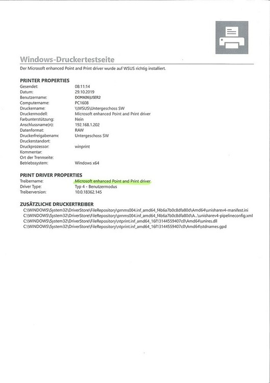 Hallo zusammen, bei uns wird über ein GPO (Computerkonfiguration\Richtlinien\Windows-Einstellungen\Druckerverbindungen) die entsprechenden Drucker für jeden PC eingerichtet. Der eigentliche Druckerserver läuft bei uns auf einem Windows Server 2012 R2 und der entsprechende Druckertreiber RICOH PCL6 V4 UniversalDriver V3.10 wurde hinterlegt. Die Benutzerprofile sind als servergespeicherte Benutzerprofile eingerichtet. Jetzt tritt jedoch auf ein paar wenigen (4 von 45) Windows 10 Pro 64bit (Version 1903) Clients das Problem auf, dass anstelle des richtigen Treibers RICOH PCL6 V4 UniversalDriver V3.10 der Microsoft enhanced Point and Print driver eingerichtet wird. Dieser verursacht zum Einen, dass die Druckeinstellungen wesentlich abgespeckter daher kommen und zum Anderen, dass manche Druckaufträge anstelle von z.B. einer Seite dann 200 Seiten und nur mit Hieroglyphen gedruckt werden. Was ich bisher versucht habe: - Drucker auf den Clients entfernt - über die Druckverwaltung den richtigen Treiber RICOH PCL6 V4 UniversalDriver V3.10 manuell hinzugefügt - in der Registry die Werte unter HKEY_CURRENT_USER\Printers\Connections und HKEY_CURRENT_USER\Printers\ConvertUserDevModesCount gelöscht - testweise bei einem Client das Benutzerprofil komplett entfernt und neu vom Server ziehen lassen Hat jemand eine Idee wie ich das Problem beheben kann? -
