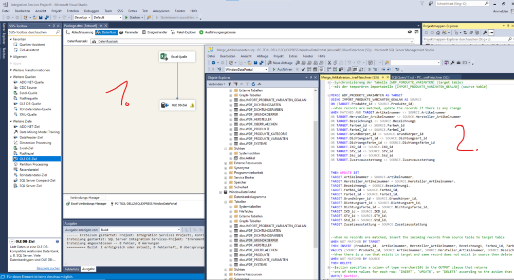 Hallo zusammen. so soll mein Workflow aussehen: 1. Der SSIS Job Importiert die Daten aus Excel in eine SQL Server Tabelle 2. Nach dem Import soll das Script für die Merge Anweisung ausgeführt werden. Der komplette manuelle Ablauf (Import + ansch. Mergen) funktioniert Dank eure Hilfe super gut. Mir würde es reichen, wenn man diese beiden Jobs automatisch hintereinander ausführen kann. Kann mir nochmal jemand helfen, wie man das umsetzen kann? Gruß Oliver