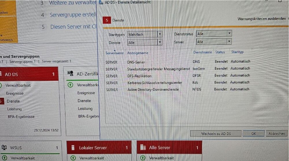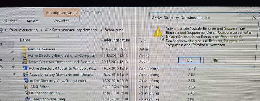 Ja Norbert, sag nix......ich weiß - Okay, ich starte den Server wieder im normalen Modus und teste es mit dem FQDN aus. - Einen Domänen Client mit RSAT Tools habe ich aktuell leider nicht - habe ich heute morgen als erstes versucht, aber ich bekomme auf der Windows 10 Büchse keine RSAT Tools installiert. So, Server wieder normal gestartet. Dann auf nem Laptop mich versucht zu verbinden: runas /netonly /user:IT@domain.local "mmc dsa.msc /server=Server.domain.local" Und nun ? Also das Kennwort der Admins war/ist definitiv schon älter - das hat Pingcastle auch angemeckert. d.h. was soll ich denn als nächstes tun? -