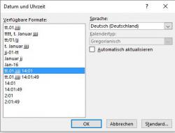 2. Hallo Welt, auf einem Windows 10 Rechner stelle ich das Datumsformat auf Deutsch (Deutschland) über die Systemsteuerung korrekt ein. Bzw. war nach der Installation korrekt eingestellt. Im Office 2016 öffne ich meine bisherigen Dokument, überall als Platzhalter tt.MM.jjjj. Nach Adam Riese müsste nun eigentlich das Datum korrekt eingetragen sein. Weit gefehlt, Ich erhalte immer tt.01.jjjj. Auch Großbuchstaben TT.MM.JJJJ werden zu TT.01.JJJJ. Stelle ich das Datumsformat aber auf dd.MM.yyyy um, erhalten ich in den Dokumenten das korrekte 06.01.2016. Nu könnte man sagen, na dann machs halt so, aber im Powerpoint 2016 habe ich gar nicht die Möglichkeit ein "eigenes" Datumsformat zu kreiren, sondern bin auf die in der Systemsteuerung definierten Formate angewiesen. Wie bringe ich das Office 2016 dazu die Systemdatumsformate zu aktzeptieren? Danke im Voraus. Pitti