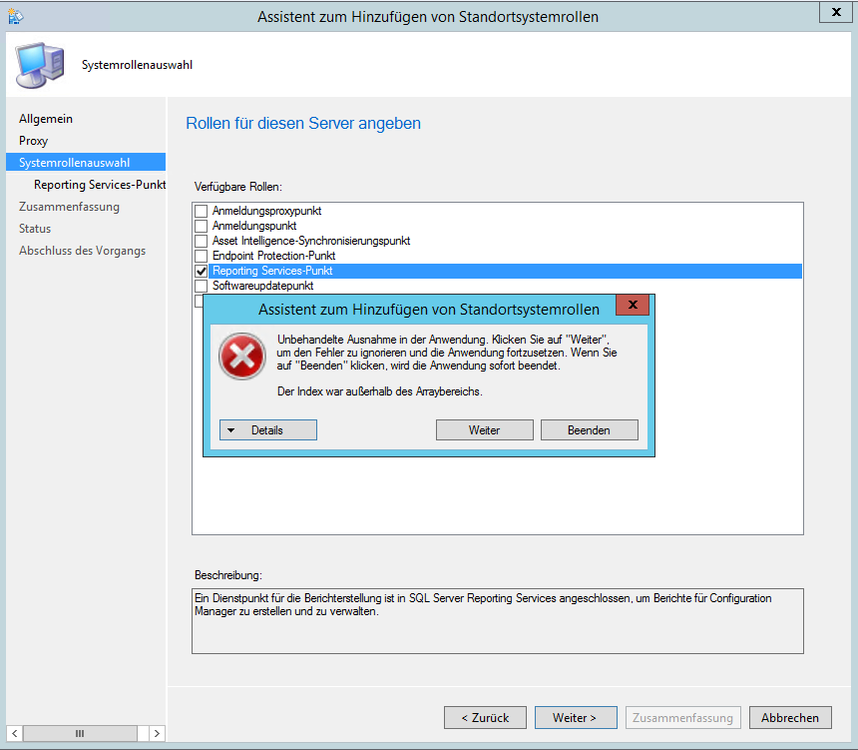 Hallo zusammen, ich versuche nun seit Wochen den Reporting Punkt auf dem SCCM Server 2012 Vers.1810 zu installieren. Wir haben einen Zentralen Datenbankserver auf diesem läuft die SCCMDatenbank alles Tip Top Es gibt auch die Reporting Instanz sowie einen Lokale Datenbank mit Reporting auf dem SCCM Server selbst. Jedoch lässt sich der Reporting Service-Punkt nicht installieren. Alle anderen Funktionieren ohne Probleme... Siehe Angehängtes Bild. Hab ach mal den Text kopiert der in den Details steht! Vielleicht hatte das schon mal jemand?! Informationen über das Aufrufen von JIT-Debuggen anstelle dieses Dialogfelds finden Sie am Ende dieser Meldung. ************** Ausnahmetext ************** System.IndexOutOfRangeException: Der Index war außerhalb des Arraybereichs. bei Microsoft.ConfigurationManagement.AdminConsole.SiteSystems.SrsReportingPointControl.GetDatabaseServerAndName(String& databaseServer, String& databaseName) bei Microsoft.ConfigurationManagement.AdminConsole.SiteSystems.SrsReportingPointControl.InitializeEmbeddedProperties() bei Microsoft.ConfigurationManagement.AdminConsole.SiteSystems.SrsReportingPointControl.InitializeResultObject() bei Microsoft.ConfigurationManagement.AdminConsole.SiteSystems.SrsReportingPointControl.InitializePageControl() bei Microsoft.ConfigurationManagement.AdminConsole.SmsWizardPage.Initialize() bei Microsoft.ConfigurationManagement.AdminConsole.SmsWizardPage.OnActivate() bei Microsoft.ConfigurationManagement.AdminConsole.WizardFramework.WizardPage.Activate() bei Microsoft.ConfigurationManagement.AdminConsole.WizardFramework.WizardForm.OnNext() bei Microsoft.ConfigurationManagement.AdminConsole.WizardFramework.WizardForm.OnNextClicked(Object sender, EventArgs e) bei Microsoft.ConfigurationManagement.AdminConsole.WizardFramework.NavigationButtonBar.OnNext(Object sender, EventArgs e) bei System.Windows.Forms.Control.OnClick(EventArgs e) bei System.Windows.Forms.Button.OnClick(EventArgs e) bei System.Windows.Forms.Button.OnMouseUp(MouseEventArgs mevent) bei System.Windows.Forms.Control.WmMouseUp(Message& m, MouseButtons button, Int32 clicks) bei System.Windows.Forms.Control.WndProc(Message& m) bei System.Windows.Forms.ButtonBase.WndProc(Message& m) bei System.Windows.Forms.Button.WndProc(Message& m) bei System.Windows.Forms.Control.ControlNativeWindow.OnMessage(Message& m) bei System.Windows.Forms.Control.ControlNativeWindow.WndProc(Message& m) bei System.Windows.Forms.NativeWindow.Callback(IntPtr hWnd, Int32 msg, IntPtr wparam, IntPtr lparam) ************** Geladene Assemblys ************** mscorlib Assembly-Version: 4.0.0.0. Win32-Version: 4.8.4150.0 built by: NET48REL1LAST_C. CodeBase: file:///C:/Windows/Microsoft.NET/Framework/v4.0.30319/mscorlib.dll. ---------------------------------------- Microsoft.ConfigurationManagement Assembly-Version: 5.0.0.0. Win32-Version: 5.1810.1022.1003. CodeBase: file:///E:/Program%20Files/Microsoft%20Configuration%20Manager/AdminConsole/bin/Microsoft.ConfigurationManagement.exe. ---------------------------------------- System Assembly-Version: 4.0.0.0. Win32-Version: 4.8.4001.0 built by: NET48REL1LAST_C. CodeBase: file:///C:/Windows/Microsoft.Net/assembly/GAC_MSIL/System/v4.0_4.0.0.0__b77a5c561934e089/System.dll. ---------------------------------------- System.Core Assembly-Version: 4.0.0.0. Win32-Version: 4.8.4121.0 built by: NET48REL1LAST_C. CodeBase: file:///C:/Windows/Microsoft.Net/assembly/GAC_MSIL/System.Core/v4.0_4.0.0.0__b77a5c561934e089/System.Core.dll. ---------------------------------------- Gekürzte Version..... ************** JIT-Debuggen ************** Um das JIT-Debuggen (Just-In-Time) zu aktivieren, muss in der Konfigurationsdatei der Anwendung oder des Computers (machine.config) der jitDebugging-Wert im Abschnitt system.windows.forms festgelegt werden. Die Anwendung muss mit aktiviertem Debuggen kompiliert werden. Zum Beispiel: <configuration> <system.windows.forms jitDebugging="true" /> </configuration> Wenn das JIT-Debuggen aktiviert ist, werden alle nicht behandelten Ausnahmen an den JIT-Debugger gesendet, der auf dem Computer registriert ist, und nicht in diesem Dialogfeld behandelt. Ich wäre dankbar für jeden TIPP!!! -