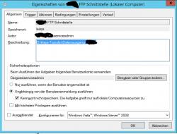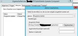 20. Hallo Board Kollegen, ich bräuchte mal eure Hilfe. Ich möchte alle 10 Minuten Dateien von einem Ordner per FTP übertragen. Ich dachte das ist ansich keine große Sache aber irgendwo hängt es noch. Ich habe eine .ftp Datei angelegt wo die ftp Befehle drin stehen. OPEN xxx USER xxx PASSWORT binary hash mput "D:\Aisys-Transfer\Datenausgang-Grizzly\*.csv" disconnect quit Das funktioniert auch wenn ich es per .bat aufrufe. Der Befehl in der .bat Datei lautet ftp.exe -n -d -i -s:Datei.ftp Die Daten werden wie gewünscht übertragen. Nun habe ich das in der Aufgabenverwaltung angelgt die alle 10 Minuten die .bat mit dem FTP aufruf starten soll. Ich sehe auch im Verlauf das die Aufgabe erfolgreiche ausgeführt wurde. Nur übertragen ist nix, keine Datei wurde per FTP übertragen. Wo ist hier mein Fehler? Ich habe mal Screenshots von der Aufgabenverwaltung angehängt. Danke schonmal :-)