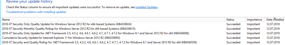 Auf der einen getesteten VM: Ja. Die wurde aber erst vorige Woche aus einem recht altenTemplate erzeugt. Da wurde vermutlich das Eine oder Andere .NET-Update übersprungen. Beim WSUS habe ich kürzlich die Express-Installation deaktiviert. Der hat dann alles nochmal heruntergeladen... Die Updates habe ich gegen 9:30 Uhr zum Download freigegeben. Ist aber eher Voodoo. Vielleicht funkt ein Virenscanner dazwischen? Wir nutzen hier auf den Servern Mcafee Move 4.6 Noch eine alte VM mit 2012R2 (unsere CA): Geht auch. Es werden alle 5 Updates installiert: (Ach ja, alle Server laufen bei uns in Neudeutsch) Und noch Einer: Auf allen VMs ist .NET 3.5 aktiviert, weil MS die nachträgliche Aktivierung irgendwie verbockt hat (Installationsdatenträger erforderlich).