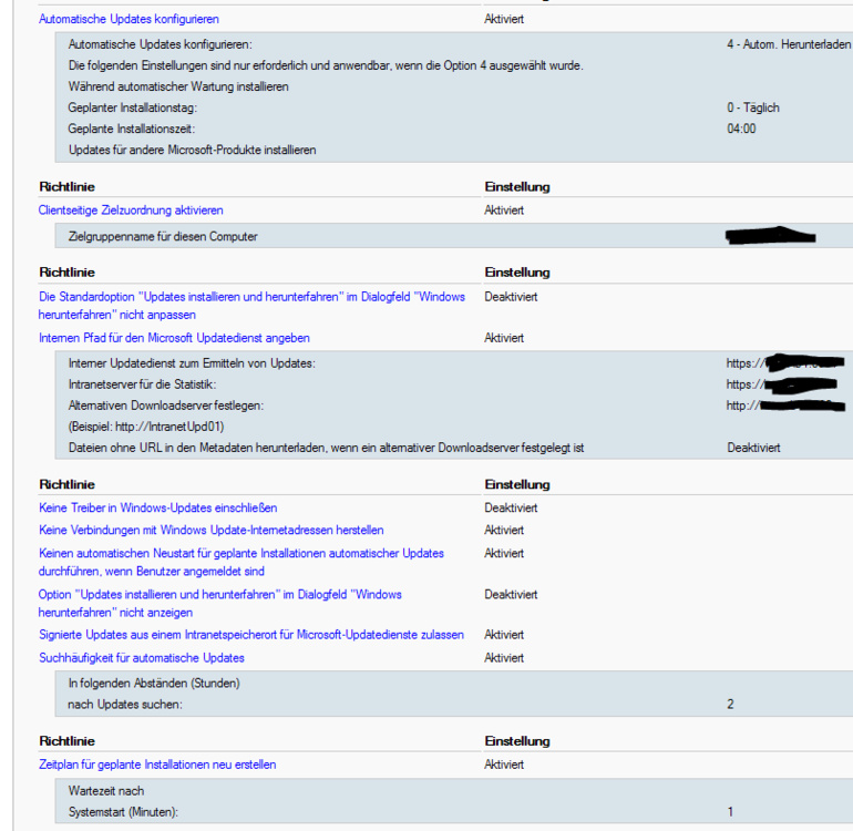 14. Hi, vielleicht kann mit mal einer helfen. Wir haben in einer begrenzten Benutzergruppe Windows 10 1607 LTSB ausgerollt. Leider weigert sich Windows 10 immer wieder standhaft, am WSUS freigegebene Updates selbstständig zu installieren. Ein Klick auf "Jetzt installieren" im Windows 10 Update Client lässt ihn dann loslegen. Die Option der Installation beim Shutdown haben die Update-Götter bei MS ja für überflüssig erachtet. Kann mal jemand die GPO anschauen und mir schreiben, was man anders einstellen müsste?