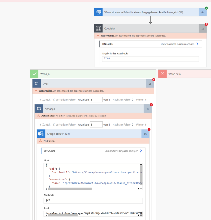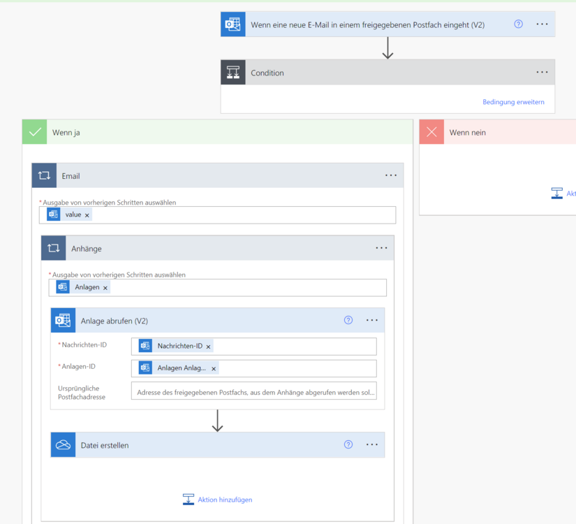 Hallo! Ich habe die Shared Mailbox xy@company.com Von jeder Email die eingeht, sollen die Anhänge (wenn möglich nach Dateiendung gefiltert) in OneDrive gespeichert werden. Als Fehler erhalte ich: Konfiguriert ist es wie folgt: Aber scheinbar findet er keine Anhänge