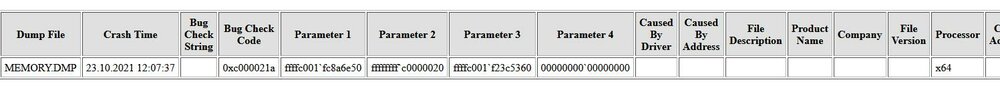 Hallo, heute hat mich ein Kunde angerufen, der mit seinem Server ein Problem hat. Lt. seiner Aussage hat er seinen Server gestern Abend neu gestartet . Nun bricht der Start mit dem Fehler 0xc000021a ab (egal in welchem Modus). Von der Original-DVD kann ich starten und dann auch über die Eingabeaufforderung auf die Datenträger zugreifen. Ich hab auch schon mehrere Lösungsansätze getestet, aber leider ohne Erfolg. Ich hab auch schon auf einer anderen Festplatte eine Sicherung, die gestern Abend erstellt wurde (mit dem Windows-eigenen Backuptool) wiederhergestellt. Auch hier wieder der genannte Fehler. Der Server wurde zuletzt vor ca. 2-3 Wochen neu gestartet, ohne Probleme. Das System ist ein Asus Serverboard mit XEON CPU. Das System ist auf einem RAID1 installiert, das über den onboard Intel-Controller konfiguriert wurde. Das System wurde im BIOS-Modus installiert (erkennbar über den Eintrag winload.exe in bcdedit). Was könnte die Ursache für dieses Problem sein? Evtl. ein Windows-Update, das seitdem letzten Neustart installiert und jetzt erst aktiviert wurde? Wenn ja, wie kann ich das wieder deinstallieren? Gibt es ein Logfile, das evtl. Informationen über den Fehler enthält, ein Minidump-File existiert nicht, das Memory.DMP hab ich mit Bluescreenview ausgelesen (Screenshot dazu anbei). Hat jemand eine Idee? Viele Grüße ag1 -