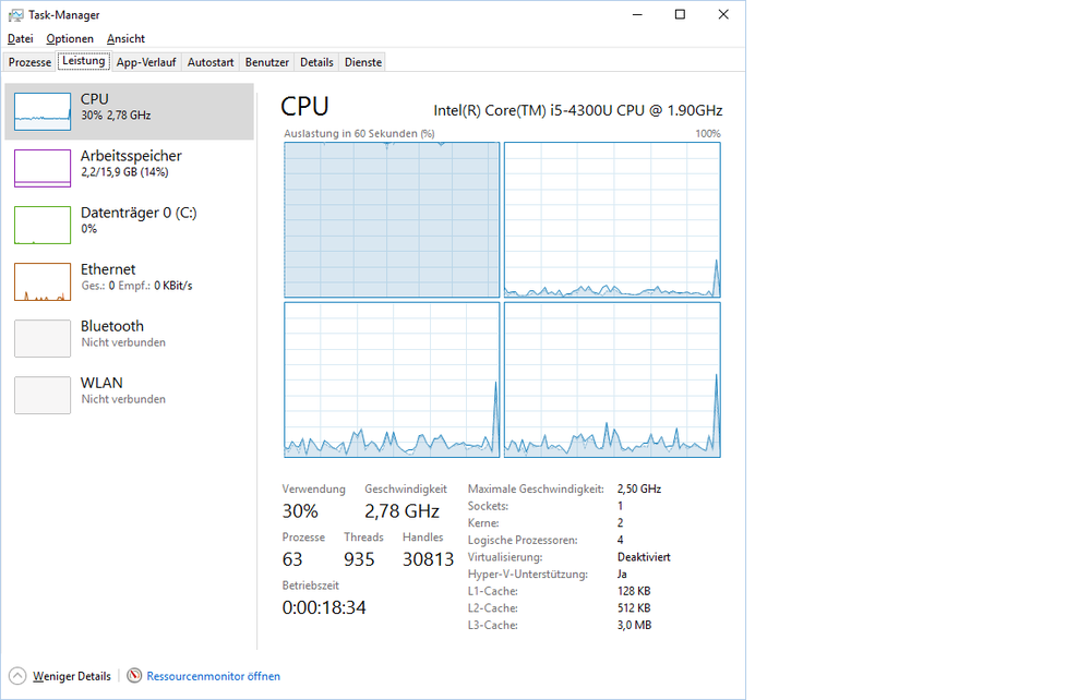 Hallo zusammen, leider finde ich trotz wiederholte Suche bislang nicht zu meinem Problem und hoffe auf das Wissen der Community Problem ist auf allen Notebooks unserer Schule zu beobachten, egal ob HP EliteBook 840 G1, ProBook 640 / 650 G1 - wir schaffen es nicht die Clients in der CPU Last komplett auf null zu fahren, sie laufen immer auf mindestens 25% CPU Last, egal ob Anwendungen und Virenscanner etc drauf sind oder nicht. Auch wenn es alte Damen sind - aktuell ist das Geld für einen Austausch der Schulleitung nicht zu entlocken - also sollen wir "das Thema gefälligst" lösen..... Nachdem die Geräte ja wirklich nicht mehr ganz tau frisch sind habe ich heute mal eins mit W10 - Build 1511 neu aufgesetzt und wirklich nichts an Anwendungen drauf außer 7-ZIP um die Treiber entpacken zu können. BIOS Reset habe ich schon hinter mir und egal ob die Hardware Virtualisierung an ist oder nicht - einer der vier logischen CPU Kerne läuft auf Anschlag.... Wie im Screenshot zu sehen handelt es sich durch die Bank um i5-4300U CPUs, RAM variiert zwischen 8 und 16GB RAM, SSD ist auch überall verbaut sprich eigentlich sollte nichts bremsen.... Auslöser ist immer der Punkt Systemunterbrechungen, hier eben 25%... Dubios: Installiere ich Windows 8.1 auf der Maschine tritt da Verhalten nicht auf ???? Gruß Norbert -