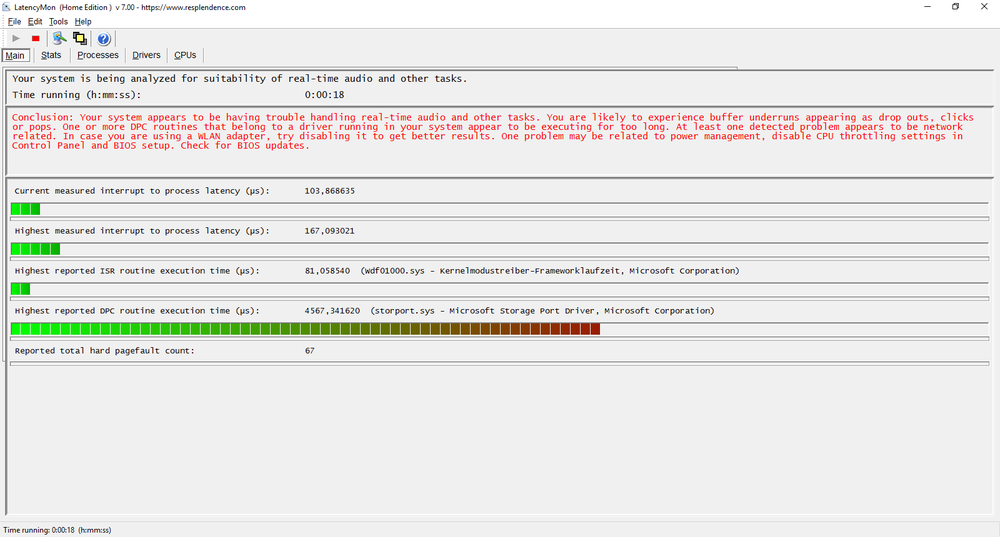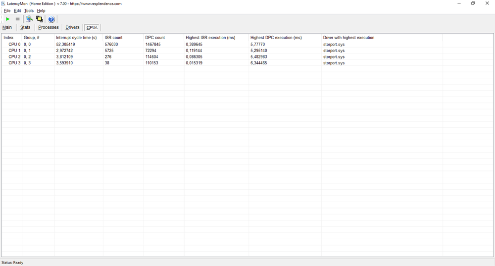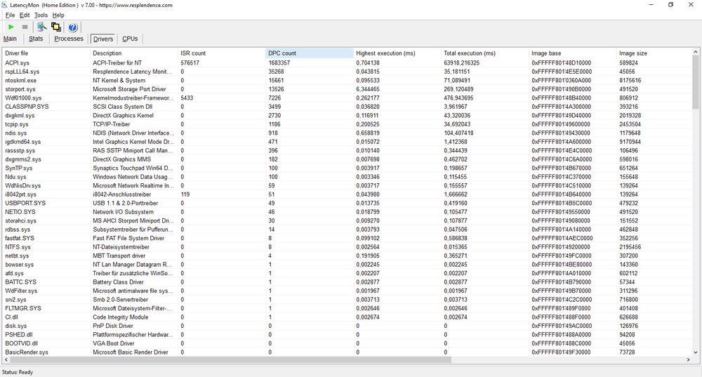 Also noch komme ich da nicht weiter, probiere aktuell Tools durch... Mit dem ersten bekomme ich "nur" diese Anzeige.... Ich glaube so langsam nähern wir uns dem Thema..... _________________________________________________________________________________________________________ REPORTED DPCs _________________________________________________________________________________________________________ DPC routines are part of the interrupt servicing dispatch mechanism and disable the possibility for a process to utilize the CPU while it is interrupted until the DPC has finished execution. Highest DPC routine execution time (µs): 6344,464715 Driver with highest DPC routine execution time: storport.sys - Microsoft Storage Port Driver, Microsoft Corporation Highest reported total DPC routine time (%): 11,701158 Driver with highest DPC total execution time: ACPI.sys - ACPI-Treiber für NT, Microsoft Corporation Total time spent in DPCs (%) 18,886942 DPC count (execution time <250 µs): 1764764 DPC count (execution time 250-500 µs): 0 DPC count (execution time 500-10000 µs): 107 DPC count (execution time 1000-2000 µs): 0 DPC count (execution time 2000-4000 µs): 4 DPC count (execution time >=4000 µs): 21 Muss ich verstehen wieso das Tool sagt die Probleme kommen von der ACPI.sys??? Ich suche wohl meinen neueren Treiber für den SATA Controller: -