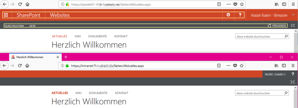 Moin, moin! Da unsere Share-Point-Admin-Stelle bis Sommer unbesetzt ist und wir die Domäne wechseln (admt) gucke ich mir an, wie ich Sharepoint portiert bekomme. Im Moment hänge ich fast nur noch an der Anpassung. Nach Portierung von intranet.Hauptdomäne (SP2013) auf spweb01-tf.Testdomäne (SP2016) ist eine neue Leiste hinzugekommen (gelb umrandet), von der ich noch keine Ahnung habe wie ich sie los werde. Wenn hier jemand einen Tipp für mich hätte, wäre ich sehr dankbar.