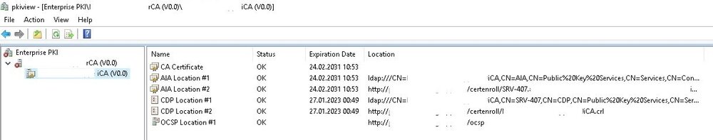 Moin, wahrscheinlich den Nils, richtig? Die PKI ist für eine Citrix-Umgebung, die eben Zertifikate für die VDIs und die Benutzer ausgibt. Die CRLs liegen alle an der selben Stelle. für die iCA sind auch beide Locations aktuell, für die rCA eben nicht die zweite Location (siehe Anhang). Aktuell habe ich auch keine Probleme mit der Zertifikatsverteilung. Mich stört nur die abgelaufene CRL und dass ich sie eben nicht verlängern kann. Gruß Andy -