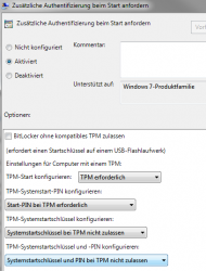 Hallo Forengemeinde, bin hier hoffentlich an der richtigen Stelle. Zu meinem Problem: Wir haben in unserem Umfeld überwiegend Dell Latitude E7250 Laptops und nutzen noch Windows 7. Da dieses Gerät auch einen TPM Chip hat, würden wir diesen auch gerne in Verbindung mit Bitlocker nutzen. Zum Test habe ich ein Gerät mal komplett von Hand installiert, keine Domänenmitgliedschaft, das nicht etwaige GPO irgendwas "verwurschteln". In der lokalen Gruppenrichtlinie, habe ich im Bereich Bitlocker-Laufwerksverschlüsselung, die Verschlüsselungsmethode auf AES-256Bit mit Diffuser umgestellt. Weiterhin unter "Betriebsystemlaufwerk" noch folgende Einstellungen gesetzt: Damit auch wirklich der TPM Chip genutzt wird. Im Gerätemanager wird mit auch ein TPM Chip Version 1.2 angezeigt. In der TPM-Verwaltung ist das Ding aktiviert und Besitz übernommen. Trotzdem lässt sich Bitlocker nicht aktivieren, mit dem Hinweis das Richtlinien im Konflikt zueinander stehen. Habe ich irgendwie einen Denkfehler? Danke für eure Hinweise.
