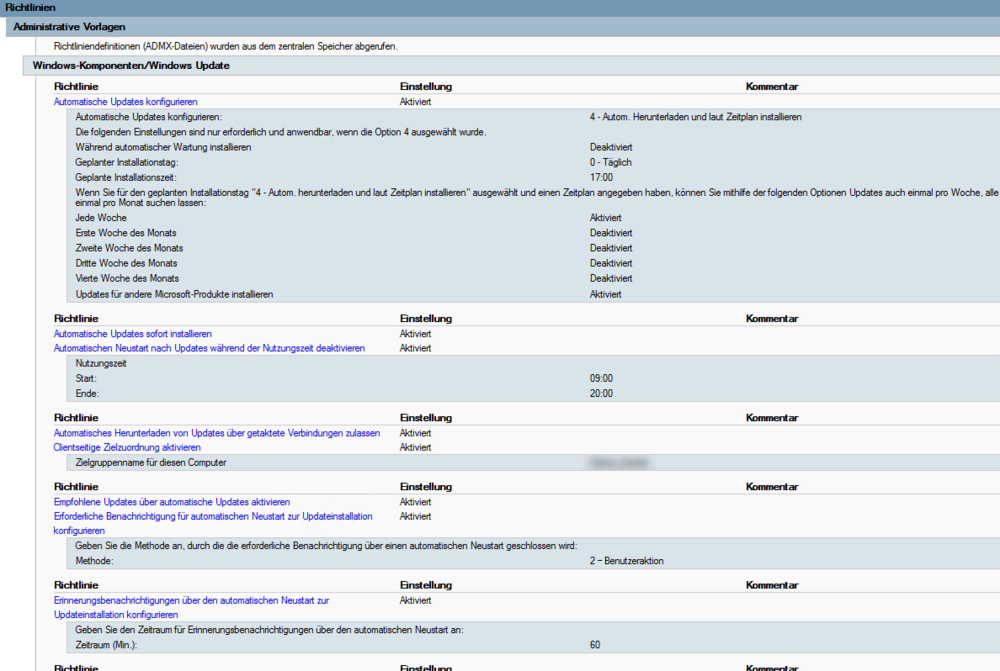 18. Liebe Forengemeinde, ich bin etwas am verzweifeln. Hintergrund: AD mit WSUS (2012R2 Server) und größtenteils Windows 7 PCs. Über eine GPO werden die Automatischen Updates installiert/verteilt (Einstellungen im Anhang). Das funktioniert soweit auch so wie gewünscht, wenn die Rechner regelmäßig in Betrieb genommen werden. Problematisch wird es, wenn sie länger nicht eingeschaltet sind. Beispielsweise war ich 2 Wochen im Urlaub, PC war in der Zeit natürlich ausgeschaltet und hat auch keine Updates gezogen oder danach gesucht. Nun hatte ich eigentlich die Erwartung, das der Rechner, sobald eingeschaltet, selbstständig nach Updates sucht und diese auch installiert. Dem war leider nicht so - auch nicht nach dem zweiten Tag. WindowsUpdate.log scheint zwar Kontakt zum WSUS herzustellen, aber meldet auch # AU disabled through Policy - wobei keine Einstellungen geändert wurden und die Automatische Updates nicht deaktiviert sind. Auch der Reg-Key noautoupdate ist auf den Wert 1 gesetzt. Habe dann einfach manuell nach Updates gesucht, das hat sofort funktioniert. Sobald ich an der entsprechenden GPO was ändere und gleich wieder zurückstelle, hat es bei einem anderen, länger ausgeschalteten Rechner nicht lange gedauert, bis auch dieser wieder Updates selbstständig gesucht hat. Und der besagte Reg-Key hatte auch wieder den Wert 0. Habe jetzt nach anderen GPO gesucht, die vielleicht konträr agieren und Windows Updates deaktivieren, aber ich finde dazu nix und sicherheitshalber habe ich die Update-GPO in der Rangfolge nach oben verschoben (Platz 1), so das diese auch definitiv als letztes angewendet wird. Bin wie gesagt etwas ratlos, vielleicht habt ihr ja den entscheidenden Tipp. Viele Grüße