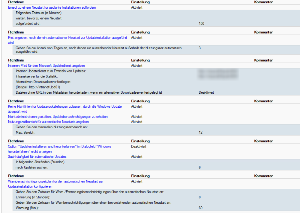 6. Hallo Forengemeinde, folgendes Problem bzw. Frage. Wir nutzen intern einen WSUS, verteilen damit die Updates auf unsere Clients - das klappt soweit auch echt gut. Problematisch ist natürlich der Reboot, der bei vielen Updates einfach nötig ist. Und natürlich haben wir viele User, die den PC einfach anlassen, über Tage und auch Wochen, ohne mal einen Neustart durchzuführen. Die Lösung ist insofern einfach, das man den Neustart einfach erzwingt. Wir würden das aber gerne so realisieren, dass man diesen Usern eine gewisse Zeit einräumt und ihn ein Hinweisfenster einblendet, das zu einem Neustart auffordert (meinetwegen auch mehrmals am Tag, bis der User einfach genervt ist und den Neustart durchführt) und nach 2 Tagen spätestens einfach den Neustart durchführt. Wir haben nun schon etliche Einstellungen ausprobiert, aber noch nie das erhoffte Ergebnis erzielt. Das Hinweisfenster wird eingeblendet, soll auch auf einen User-Input warten, ist man jedoch nicht am PC und dieser ist gesperrt, wird irgendwann trotzdem der Neustart ausgeführt - innerhalb des gleichen Tages, an dem auch Updates installiert wurden. Bin dankbar für hilfreichen Input. Anbei mal die Screenshots der Einstellungen.