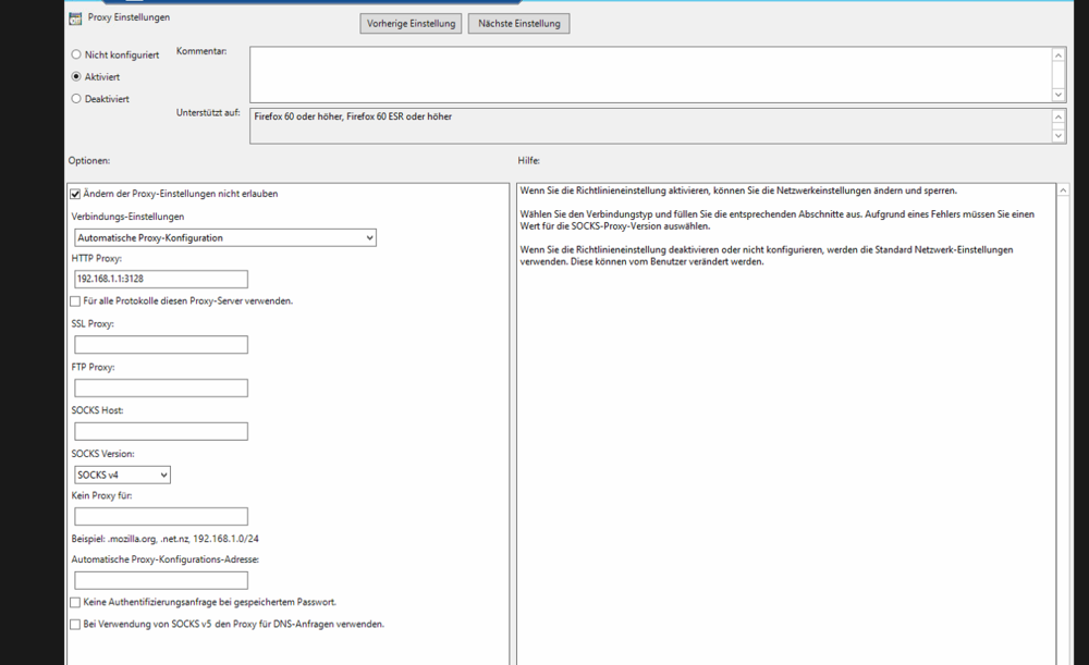 18. Moin, ich habe mir die Templates von Mozilla besorgt und entsprechend eingebunden. Vorher habe ich die Proxy Einstellungen über das Standard Template von Microsoft für Edge und Chrome bereits gesetzt. IP und Port sind dort eingestellt. In der Proxy Einstellung von Mozilla, gibt es die Einstellung HTTP Proxy, aber es kann kein Port eingetragen werden. Oder macht man das so 192.168.1.1:3128? Gruß DO Außerdem springt der immer wieder bei den Verbindungs-Einstellungen auf "Automatische Proxy-Konfiguration" zurück. Wenn ich manuell eingebe, speichere und dann wieder auf bearbeiten gehe.