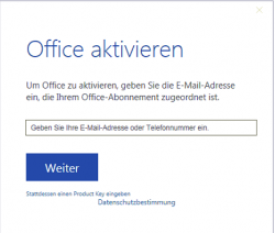 8. Guten Abend zusammen, ich versuche gerade bei einem Windows 7, 64 Bit Rechner Office 2016 zu aktivieren. Die Installation an sich lief ohne Reibung durch, doch die Aktivierung ist nicht möglich. Anbei das Bild der Aktivierungsmaske. Wenn ich im Aktivierungsfenster meine Mail-Adresse eingebe und auf "Weiter" klicke, passiert nichts. Normalerweise verschwindet doch auch der Inhalt ("Geben Sie..." im Eingabefenster, wenn man dort hineinklickt. Auch der Klick auf "Stattdessen einen Product Key eingeben" bewirkt rein gar nichts. Es passiert einfach nichts. Ich habe bisher versucht: - Chkdsk - Sfc /scannow - IE aktualisiert und auf Standardeinstellungen zurückgesetzt - Aktivierungsversuch mit einem völlig neuen User inkl. neuem Profil - Virenscanner deinstalliert Kann man Office vielleicht per Kommandozeile aktivieren? Habt ihr noch eine andere Idee? Viele Grüße und Dankeschön! Samoth