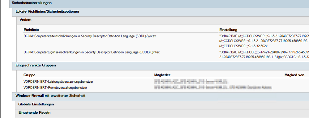 Auf die Schnelle hab ich noch das hier gefunden: https://martellotech.com/blog/enable-remote-wmi-access-for-a-domain-user-account/ Und noch eine URL für ein Script: https://docs.microsoft.com/de-de/archive/blogs/spatdsg/set-wmi-namespace-security-via-gpo-script Das schon gen. Script brauchst Du doppelt, einmal für die DCs und einmal für die Member Server. Deinen User am besten in eine Gruppe, und die Gruppe anstatt dem User verwenden. Auf einem Member Server wmimgmt.msc als Admin starten > WMI-Kontrolle > Eigenschaften >Reiter Sicherheit > Root markieren > Sicherheit unten anklicken > Erweitert anklicken > über Hinzufügen die Gruppe hinzufügen und diese Berechtigungen vergeben. Ebenfalls auf diesen und untergeordneten Namespaces anwenden. Jetzt in einer Admin Commandline diesen Befehl ausführen: wmic /namespace:\\root /output:c:\sd.txt path __systemsecurity call getSD In der auf c:\ erstellten sd.txt findet sich ein langer String: {1, 0, 4, 129, 148, 0, 0, 0, 164, 0, 0, 0, 0, 0, 0, 0, 20, 0, 0, 0 und so weiter und so fort. Diesen String von den Leerzeichen befreien und ohne die Leerzeichen in die passende VBS-Datei kopieren und die Datei speichern. Die gleiche Vorgehensweise muss auf einem DC durchgeführt werden, jetzt hast Du 2 VB-Scripte, eins für die DCs und eins für die Member Server. Die beiden Scripte kannst Du in ein Share legen und als Computerstartupscript von den Servern ausführen lassen. DCs und Member separat natürlich. Bevor es weiter geht, noch auf einen anderen Server switchen, als Admin eine Commandline öffnen und die VBS-Datei für Server ausführen: cxcript.exe c:\Pfad-zur-WMI_Server.vbs Kontrolle: Jetzt auf dem Server wmimgmt.msc als Admin ausführen und die o.g. Schritte ausführen. Ist dort die Gruppe mit den passenden Berechtigungen zu sehen? Wenn ja, dann kann das Script verwendet werden. Nach Möglichkeit auch mit dem DC-Script so verfahren. Ein GPO für DCs und ein GPO für Memberserver erstellen. Beispielhaft die Vorgehensweise für Member Server: Sicherheitseinstellungen > Lokale Richtlinien > Sicherheitsoptionen > DCOM: Computerstarteinschränkungen und Computerzugriffseinschränkungen jeweils über Sicherheit bearbeiten die Gruppe hinzufügen. Die Gruppe braucht an der Stelle alle Rechte: Lokaler Start, Remotestart, Lokale Aktivierung und Remoteaktivierung. Mit OK alles bestätigen. Jetzt noch in die eingeschränkten Gruppen, dort über den Durchsuchen Dialog die Gruppen Leistungsüberwachtungsbenutzer und Remoteverwaltungsbenutzer hinzufügen. In jede der beiden Gruppen kommt deine Gruppe als Mitglied rein. Windows Firewall Regel für WMI nicht vergessen. Ich hoffe nichts vergessen zu haben, einfach mal den ersten Teil mit dem manuellen ausprobieren, wenn das klappt, sollte es mit dem GPO auch klappen. -