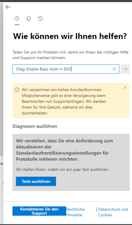 Hallo, https://aka.ms/PillarEXOBasicAuth eine Übersicht / Liste von solchen magic phrases gibt es nicht nehme ich an. Frage nur so, weil die z.B. schwer zu finden sind. https://techcommunity.microsoft.com/t5/exchange-team-blog/basic-authentication-and-exchange-online-june-2021-update/ba-p/2454827 ...But if you want to get straight to the new Basic Auth self-help diagnostic simply enter the magic phrase.... https://aka.ms/PillarEXOBasicAuth Diag: Enable Basic Auth in EX Diag: Enable Basic Auth in EXO https://techcommunity.microsoft.com/t5/exchange-team-blog/basic-authentication-and-exchange-online-june-2021-update/ba-p/2454827 -