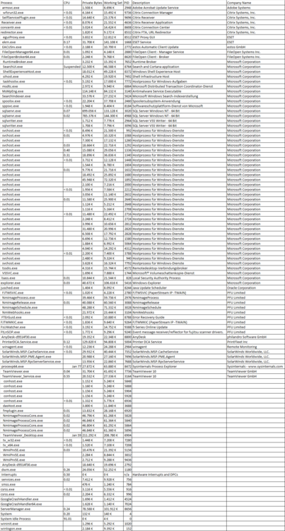 Processexplorer zeigt diese Apps nach Systemneustart armsvc.exe 1.508 K6.696 K2948Adobe Acrobat Update ServiceAdobe Systems wfcrun32.exe< 0.014.164 K15.492 K9736Citrix Connection ManagerCitrix Systems, Inc. SelfServicePlugin.exe< 0.0114.640 K23.376 K9696Citrix ReceiverCitrix Systems, Inc. Receiver.exe< 0.018.076 K21.552 K4636Citrix Receiver ApplicationCitrix Systems, Inc. concentr.exe< 0.013.024 K14.424 K8608Citrix Connection CenterCitrix Systems, Inc. redirector.exe 1.820 K9.172 K8532Citrix FTA, URL RedirectorCitrix Systems, Inc. eguiProxy.exe< 0.013.832 K12.812 K8512ESET Proxy GUIESET ekrn.exe0.1731.708 K141.108 K1668ESET ServiceESET EACUSrv.exe< 0.012.188 K10.700 K2772estos Automatic Client Updateestos GmbH FileOpenManager64.exe0.011.092 K4.148 K2880FileOpen Client - Manager ServiceFileOpen Systems Inc. FileOpenBroker64.exe0.012.248 K9.768 K8620FileOpen Client - BrokerFileOpen Systems Inc. RuntimeBroker.exe 3.232 K15.392 K7652Runtime BrokerMicrosoft Corporation SearchUI.exeSuspended12.500 K46.588 K8764Search and Cortana applicationMicrosoft Corporation ShellExperienceHost.exe 18.012 K49.228 K8372Windows Shell Experience HostMicrosoft Corporation sihost.exe 4.292 K19.920 K7492Shell Infrastructure HostMicrosoft Corporation taskhostw.exe< 0.015.192 K17.000 K7772Hostprozess für Windows-AufgabenMicrosoft Corporation msdtc.exe 2.972 K9.940 K6864Microsoft Distributed Transaction Coordinator-DienstMicrosoft Corporation MsMpEng.exe 114.148 K84.132 K3140Antimalware Service ExecutableMicrosoft Corporation SearchIndexer.exe 33.576 K27.232 K5624Microsoft Windows Search-IndexerstellungMicrosoft Corporation spoolsv.exe< 0.0122.204 K37.708 K2460Spoolersubsystem-AnwendungMicrosoft Corporation sppsvc.exe< 0.011.948 K8.404 K8184Softwareschutzplattform-Dienst von MicrosoftMicrosoft Corporation sqlservr.exe0.07699.056 K133.128 K3020SQL Server Windows NT - 64 BitMicrosoft Corporation sqlservr.exe0.02785.376 K144.300 K4988SQL Server Windows NT - 64 BitMicrosoft Corporation sqlwriter.exe 1.712 K7.776 K2964SQL Server VSS Writer - 64 BitMicrosoft Corporation sqlwriter.exe 1.708 K7.796 K3096SQL Server VSS Writer - 64 BitMicrosoft Corporation svchost.exe< 0.018.496 K21.500 K992Hostprozess für Windows-DiensteMicrosoft Corporation svchost.exe0.014.976 K10.320 K1088Hostprozess für Windows-DiensteMicrosoft Corporation svchost.exe 7.300 K17.132 K1260Hostprozess für Windows-DiensteMicrosoft Corporation svchost.exe0.0318.664 K22.716 K1292Hostprozess für Windows-DiensteMicrosoft Corporation svchost.exe0.4015.080 K29.056 K1336Hostprozess für Windows-DiensteMicrosoft Corporation svchost.exe0.3118.896 K36.836 K1340Hostprozess für Windows-DiensteMicrosoft Corporation svchost.exe< 0.013.732 K12.128 K1448Hostprozess für Windows-DiensteMicrosoft Corporation svchost.exe 1.544 K6.780 K1604Hostprozess für Windows-DiensteMicrosoft Corporation svchost.exe0.019.776 K21.716 K1632Hostprozess für Windows-DiensteMicrosoft Corporation svchost.exe 18.492 K25.892 K1680Hostprozess für Windows-DiensteMicrosoft Corporation svchost.exe 45.948 K72.320 K1892Hostprozess für Windows-DiensteMicrosoft Corporation svchost.exe 2.100 K7.216 K2000Hostprozess für Windows-DiensteMicrosoft Corporation svchost.exe< 0.011.956 K7.584 K2212Hostprozess für Windows-DiensteMicrosoft Corporation svchost.exe 3.056 K11.140 K2632Hostprozess für Windows-DiensteMicrosoft Corporation svchost.exe0.0111.580 K25.900 K2640Hostprozess für Windows-DiensteMicrosoft Corporation svchost.exe 1.124 K5.212 K2648Hostprozess für Windows-DiensteMicrosoft Corporation svchost.exe 1.116 K5.164 K2708Hostprozess für Windows-DiensteMicrosoft Corporation svchost.exe< 0.0111.480 K22.492 K2716Hostprozess für Windows-DiensteMicrosoft Corporation svchost.exe 2.248 K8.412 K2724Hostprozess für Windows-DiensteMicrosoft Corporation svchost.exe 3.996 K10.656 K2812Hostprozess für Windows-DiensteMicrosoft Corporation svchost.exe 31.480 K20.996 K2820Hostprozess für Windows-DiensteMicrosoft Corporation svchost.exe 6.508 K17.792 K2828Hostprozess für Windows-DiensteMicrosoft Corporation svchost.exe 6.696 K12.736 K1580Hostprozess für Windows-DiensteMicrosoft Corporation svchost.exe 1.884 K6.992 K5064Hostprozess für Windows-DiensteMicrosoft Corporation svchost.exe 4.040 K14.292 K4312Hostprozess für Windows-DiensteMicrosoft Corporation svchost.exe< 0.012.200 K7.400 K3788Hostprozess für Windows-DiensteMicrosoft Corporation svchost.exe 2.480 K9.324 K940Hostprozess für Windows-DiensteMicrosoft Corporation svchost.exe 3.628 K16.324 K7792Hostprozess für Windows-DiensteMicrosoft Corporation tssdis.exe 4.316 K15.744 K4572Remotedesktop-VerbindungsbrokerMicrosoft Corporation VSSVC.exe 1.696 K7.888 K1744Microsoft® Volumeschattenkopie-DienstMicrosoft Corporation lsass.exe0.0110.844 K21.544 K828Local Security Authority ProcessMicrosoft Corporation explorer.exe0.0340.672 K106.616 K5416Windows-ExplorerMicrosoft Corporation jusched.exe 1.404 K8.092 K8244Java Update SchedulerOracle Corporation FJTWSVIC.exe< 0.011.020 K4.228 K2780FJTWSVIC (PaperStream IP -TWAIN)PFU Limited NmImageProcess.exe 39.464 K59.736 K2976NmImageProcessPFU Limited NmImageRelease.exe0.0140.088 K60.560 K3088NmImageReleasePFU Limited NmImageSchedule.exe 48.288 K71.332 K3028NmImageSchedulePFU Limited NmWebhooks.exe 21.972 K23.444 K3104NmWebhooksPFU Limited FTErGuid.exe< 0.012.092 K10.880 K8788Error Recovery GuidePFU Limited FJTWMKIC.exe< 0.011.836 K9.640 K9264FJTWMKIC (PaperStream IP -TWAIN)PFU Limited FsUWatcher.exe< 0.013.192 K14.752 K9388fi Series Online UpdatePFU Limited FtLnSOP.exe< 0.011.772 K9.296 K9240Event message receiver/reflector for fujitsu scanner drivers.PFU Limited AnyDesk-d9514f30.exe 19.352 K22.348 K8800AnyDeskphilandro Software GmbH PrinterDCA.Service.exe0.12129.820 K94.808 K5004Printer DCA ServicePrintFleet Inc winagent.exe< 0.0112.236 K24.288 K2984winagentRemote Monitoring SolarWinds.MSP.CacheService.exe< 0.0129.932 K40.444 K7352SolarWinds.MSP.CacheServiceSolarWinds Worldwide, LLC. SolarWinds.MSP.PME.Agent.
