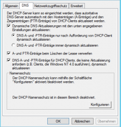 Hallo Jan, ich habe alles so konfiguriert, wie in deinem Link beschrieben. Die AD-integrierte DNS-Zone akzeptiert nur "sichere Updates". Der DHCP-Server ist in den DNS-Optionen so konfiguriert, dass er die "DNS-Einträge nur nach Aufforderung vom DHCP-Client dynamisch aktualisiert". Leider ist es dennoch so, dass der DHCP-Server alle DNS-Registrierungen meiner Windows 10 Clients übernimmt. Schaue ich im DNS-Server nach den Einträgen in der DNS-Zone so wurde der Eintrag durch den DHCP-Server und nicht durch das Computerkonto erstellt. Windows 10 sollte die DNS-Registrierung doch selbst übernehmen können und nicht an den DHCP-Server delegieren. Weshalb fordern die DHCP-Clients den DHCP-Server zur DNS-Registrierung auf? -