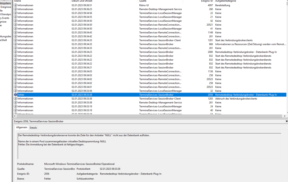 Moin und frohes Neues, leider bringt das neue Jahr merkwürdige Probleme mit sich. Wir haben eine 2019er RDS Farm (1x Broker, 6x RDS Hosts, kein Gateway). Die Farm läuft schon seit Jahren ohne größere Probleme. Letzte Woche wollten wir über den Broker Support machen und die RDS Konsole über den Servermanager konnte nichts anzeigen außer folgendes Bild Zugriff über powershell auch nicht möglich: Ereignissanzeige: zeigt auch keine besonderen Fehler bis auf ID 2056 Datenbankfehler aber der wird weiter oben durch ID 2080 wieder "aufgehoben" und Verbindung zur Datenbank angeblich wiederhergestellt. Es scheint so als ob gar kein Broker vorhanden ist, obwohl er natürlich die Rolle hat und grundsätzlich funktioniert die Farm auch und user können sich anmelden und auf den RDS Hosts arbeiten. Nur können wir(Admins) nicht auf die Farm zugreifen, für zb user Support oder auch neue RDS Hosts hinzufügen oder entfernen. Da ich schon recht viel recherchiert habe und keine befriedigende Lösung gefunden hatte, haben wir den Server aus einem Backup geholt und dann lief er ca. 1 Stunde und danach wieder das gleiche Bild. Nächste Maßnahme war paralel eine neue RDS Umgebung am Freitag hochgezogen. Funktionierte am Freitag alles und heute ins Büro gekommen und auch der völlig neu aufgesetzte RDS Broker hat das gleiche Problem. Hat vielleicht jemand eine Idee? -
