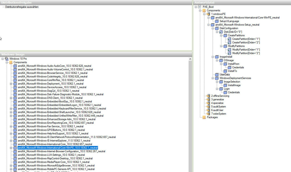 Die unattended Dateien wurden mit dem Windows System Image Manager in der Version 10.0.18362.144 erstellt. Siehe auch Anhang Vorgehen: analog der Seite http://computeranleitungen.de/wds-antwortdatei-erstellen/ einfach auf Windows 10 adaptiert mit den entsprechenden Windows 10 ISO Files von Microsoft (MSDN) -