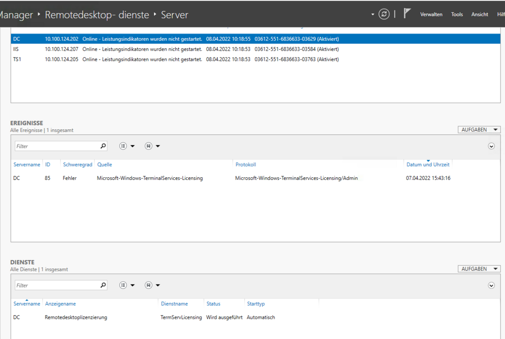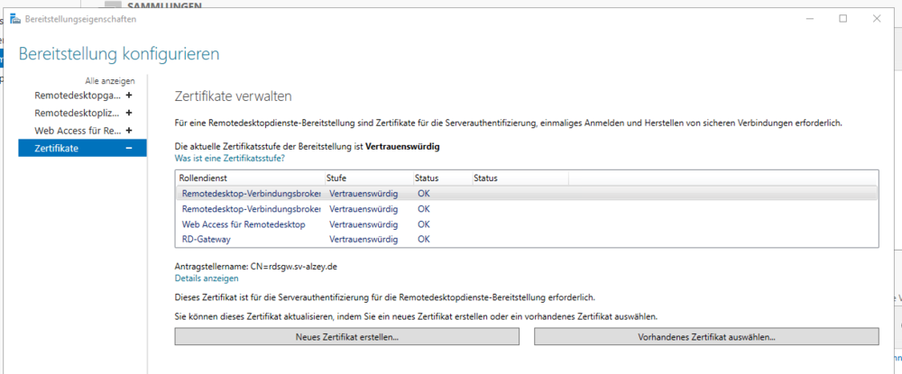 Ich gehe auf das Interface über das Rdweb also URL und /rdweb und dann melde ich mich an. Ich sehe alles was in der Sammlung konfiguert ist und kann auch die RDP laden. Über RemoteApp und Desktopverbindungen das gleiche, URL eingeben und den Webfeed. Dann kommen alle Programme. Klicke ich sie an, kommt die gleiche Fehlermeldung. Die Dienste scheinen zu laufen. Unter Server wird im Server-Manger jeder der 3 Server angezeigt. Jedoch unter Dienste habe ich nur den DC der die Lizenzierung darstellt. -