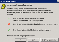 Hallo, also... Die Meldung kommt beim Start von Outlook innerhalb das Lans. Die Zeiten auf dem Server stimmen. Es geht hier nicht um Browster und auch nicht über eine Zugriff über das Internet. (LAN) Ich habe das ZERTIFIKAT nur installiert. Wiso läuft das ab? So eineFall hatte ich noch nie und ich betreibe einige Netzwwerke die diesem doch seht ähneln.