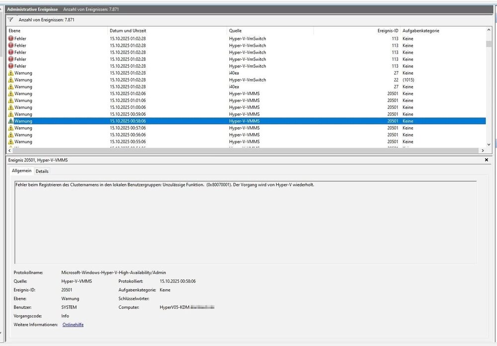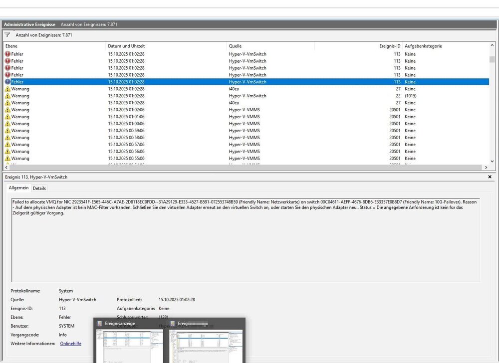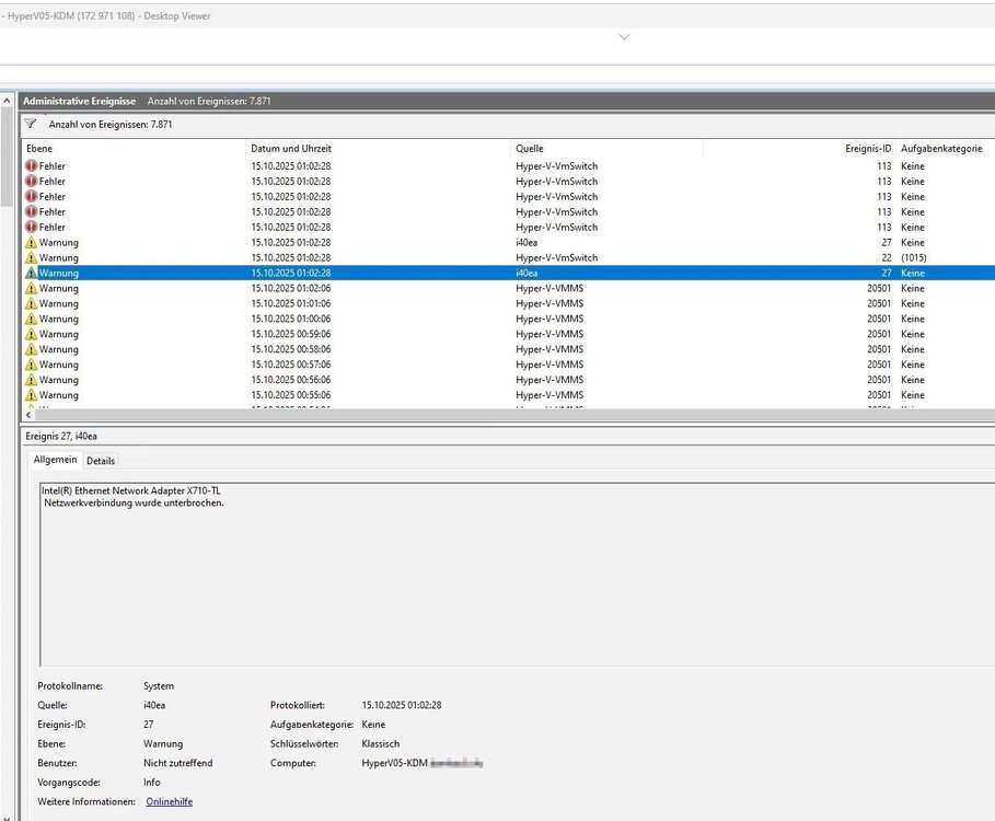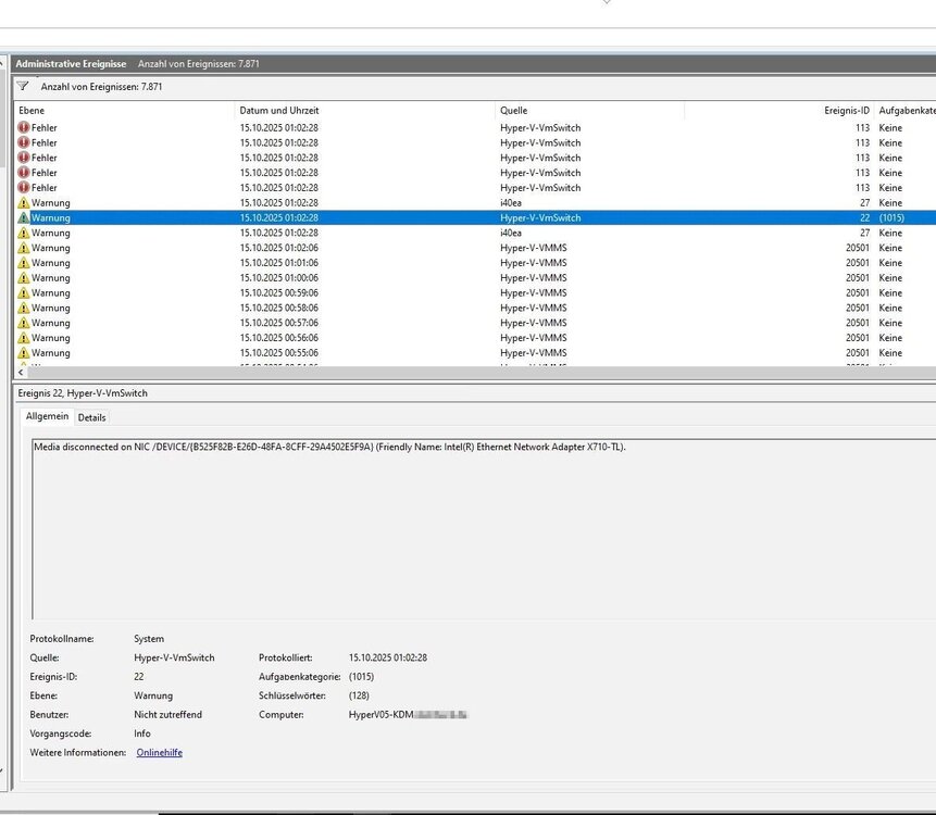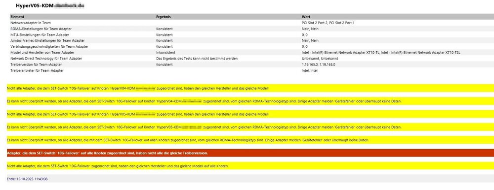 Hallo zusammen, wir haben bei einem Kunden vor ein paar Monaten zwei neue HyperV-Hosts hingestellt. Vor ca. 4 Wochen kam es dann zu einem Ausfall auf einem der Hosts. Sie sind zwar im Failovercluster, aber die angelegten VM's wurden nicht korrekt verschoben und waren in einem undefinierten Zustand. Nach Prüfung des Fehlers ist uns aufgefallen, dass am Host in der Nacht die Netzwerkkarte getrennt wurde, was dann dutzende Folgefehler produziert hat. Eine Woche später erneut der genau gleiche Ausfall. Wir haben dann alle VM's auf den zweiten Host verschoben und sind von einer defekten Netzwerkkarte ausgegangen. Nun haben wir heute den gleichen Fehler auf dem zweiten Host. Die Meldungen aus dem Ereignisprotokoll hänge ich ganz unten an. Hört sich jetzt b***d an, aber bei allen drei Ausfällen wurde vorher vom Kunden selbst die externe HDD getauscht, für die Backup Copy Jobs. Ich gehe mal nicht davon aus, dass das damit etwas zu tun haben kann, aber ich erwähne es mal lieber. Die Hosts sind: Windows Server 2022 Fujitsu PRIMERGY RX2530 M7 bzw. PRIMERGY RX2530 M7S CPU: Intel(R) Xeon(R) Gold 5416S (CORES 16) Motherboard: FUJITSU D3982-A1 Hier noch ein paar Infos zu Netzwerkkarten: Name : Flexible LOM1 Port 3 Description : Intel(R) Ethernet Network Adapter I350-T4 for OCP NIC 3.0 Manufacturer : InterfaceDescription : Intel(R) Ethernet Network Adapter I350-T4 for OCP NIC 3.0 PNPDeviceID : Name : Flexible LOM1 Port 2 Description : Intel(R) Ethernet Network Adapter I350-T4 for OCP NIC 3.0 #4 Manufacturer : InterfaceDescription : Intel(R) Ethernet Network Adapter I350-T4 for OCP NIC 3.0 #4 PNPDeviceID : Name : PCI Slot 2 Port 1 Description : Intel(R) Ethernet Network Adapter X710-T2L Manufacturer : InterfaceDescription : Intel(R) Ethernet Network Adapter X710-T2L PNPDeviceID : Name : PCI Slot 2 Port 2 Description : Intel(R) Ethernet Network Adapter X710-TL Manufacturer : InterfaceDescription : Intel(R) Ethernet Network Adapter X710-TL PNPDeviceID : Name : Onboard LAN Description : Intel(R) I210 Gigabit Network Connection Manufacturer : InterfaceDescription : Intel(R) I210 Gigabit Network Connection PNPDeviceID : Name : Flexible LOM1 Port 1 Description : Intel(R) Ethernet Network Adapter I350-T4 for OCP NIC 3.0 #3 Manufacturer : InterfaceDescription : Intel(R) Ethernet Network Adapter I350-T4 for OCP NIC 3.0 #3 PNPDeviceID : Name : Flexible LOM1 Port 4 Description : Intel(R) Ethernet Network Adapter I350-T4 for OCP NIC 3.0 #2 Manufacturer : InterfaceDescription : Intel(R) Ethernet Network Adapter I350-T4 for OCP NIC 3.0 #2 PNPDeviceID : Edit: Ich habe noch einen Screenshot angehängt von der Clusterüberprüfung. Dort gibt er mir Warnungen und Fehler bei der Switch Konfiguration aus. -