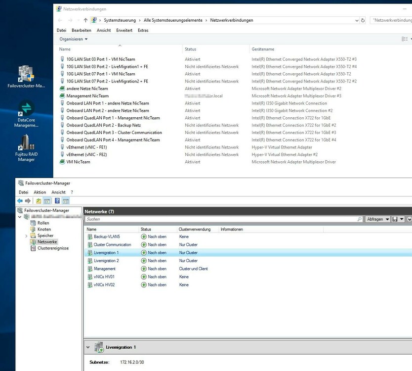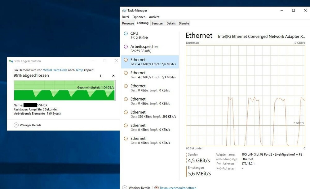 Servus...es geht um zwei Server 2019 welche die FailoverCluster Rolle installiert haben, und als ClusterStorage den eigenen internen Speicher nutzen der intern über iSCSI angebunden ist, bereitgestellt durch die Datacore SanSymphony Software (wird gesynct über 2x 16Gbs FC undmittels MultiPath über 2x 10Gbs überkreuz verbunden) die beiden LiveMigration 10G Netzwerke existieren auch auf den 2. Knoten genau so, stecken auch in einem Subnet und im selben VLAN. das selbe gilt auch für die Management Karten die geteamt sind, sowie für das BackupNetz und die ClusterCommunication. was mich stark wundert ist: Wenn ich vom Knoten1(HV01) auf Knoten2 (HV02) eine große VHDX Kopiere welche NICHT im Clustershare ist, sondern wirklich auf der lokalen SAS SSD Liegt - dannn nimmt Windows immer bevorzugt die backupNetz Netzwerkkarte und die ClusterCommunication zum übertragen der großen Datei. Da kopiert er zwar schon mit 200MB/s dank SMB3.0 , aber warum zum geier nutzt windows da nicht einfach die beiden 10G Karten im MultiChanel SMB3.0 betrieb? Das macht Windows erst dann, wenn ich die BackupNetz karte und die Cluster Com karte deaktiviere - erst dann geht er über beide 10G Karten. gut, da kopiert er auch nur mit 1GB/s aber das könnte an den SAS SSDs liegen...er nutzt dann aber auch wirklich beide 10G karten. Die Nic Teams die zu sehen sind sind als LACP HASH eingerichtet. Ich habe schon die Metrik manuell auf 1 und 2 gesetzt bei den beiden LiveMigration karten...aber ignoriert Windows trotzdem und nimmt bevorzugt die anderen karten...Windows könnte ja auch das Management NicTem mit nutzen - machts aber auch nicht. Verstehe ich nicht diese logik... Eine Livemigration der VMs nutz auch immer nur ein LAN Adapter, obwohl 2 Migrationen gleichzeitig durchgeführt werden -