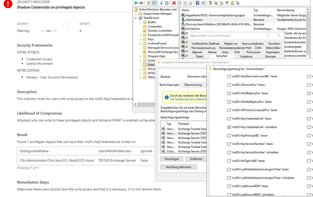 Servus miteinander, Ich habe gerade in einer Testumgebung wo es nur einen neuinstallierten und unkonfigurierten DC und einen Exchange 2019 gibt, mal PurpleKnight angeworfen. Da kommen natürlich einige Meldungen zusammen, aber eine ist recht hartnäckig wo ich nicht wirklich weiter weiß, was ich da noch einstellen kann um das Testsystem zu härten (und später natürlich auch das Produktivsystem) PurpleKnight meldet, dass die Gruppe Exchange Servers im Domänen-Administrator Konto den msDS-KEyCredentialLink wert schreiben kann. Nur habe ich ich dies bereits über eine Sicherheits-Verweigerungsregel im Administrator-Konto angepasst, dass die ExchangeServers Gruppe nicht schreiben darf auf den Eintrag. Dennoch meckert PurpleKnight diesen wert an. Was müsste ich den jetzt wie ändern, damit das sauber ist? -