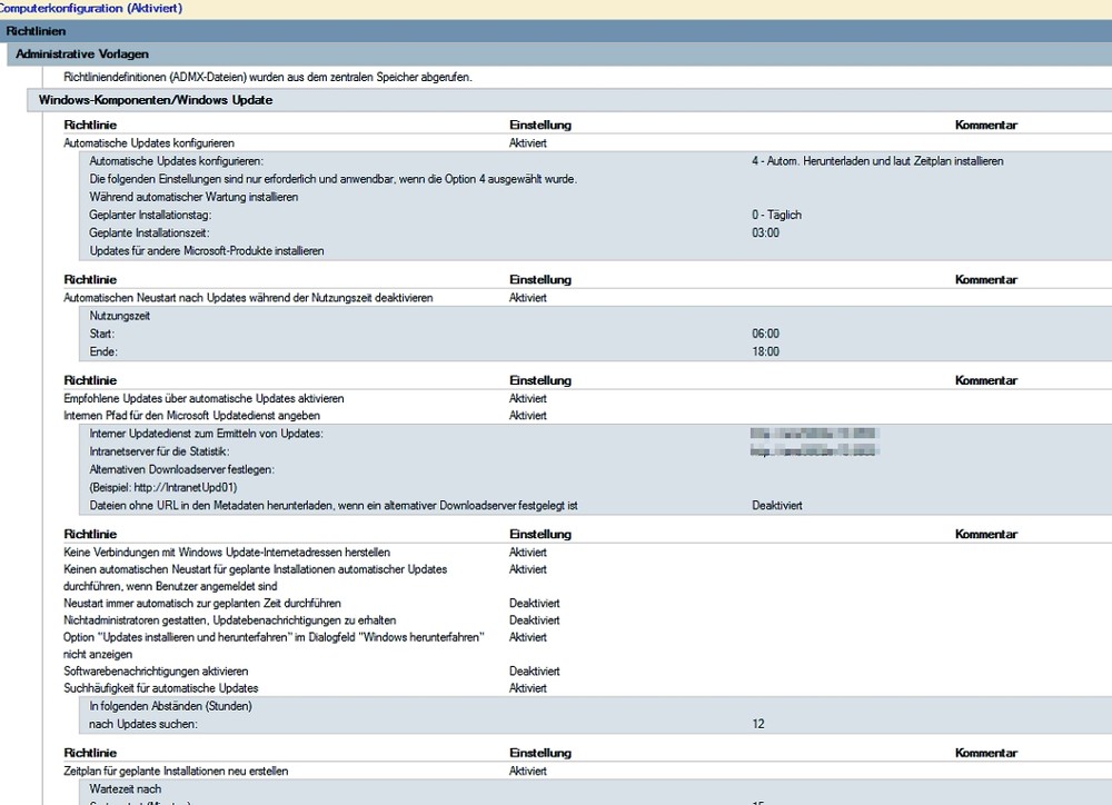 Guten Tag, Vor kurzem wurden die DCs auf Windows Server 2016 migriert. Seit dem, starten die Windows 7 Clients und auch die Windows Server 2008 und 2012 automatisch nach 15 min neu. In den GPOs wurde vom WSUS nichts verändert. GPResult zieht auch alle Richtlinien. Im Anhang sieht man wie die Updates konfiguriert sind. Die Windows 10 Clients und auch die 2016er Server sind davon nicht betroffen. Vielleicht habt Ihr einen Rat. Gruß Chris -