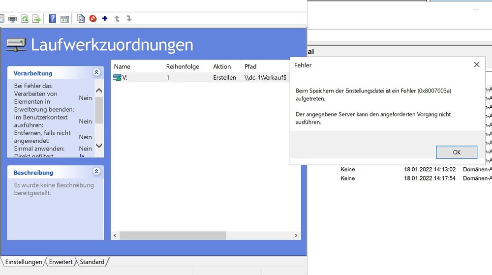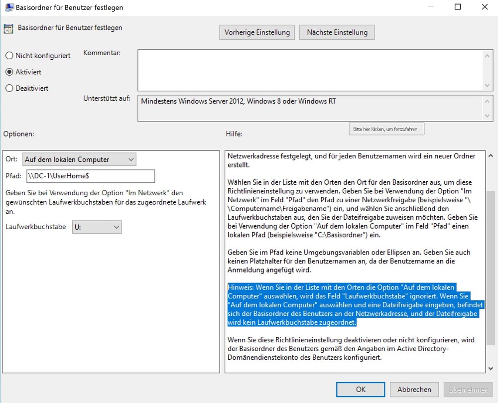Moin,ich hoffe ich fasse das mal in die richtigen Worte.Ich möchte ein Basisverzeichnis einrichten und via Ordnerumleitung "Dokumente" dahin umleiten. Das alles via GPO. Eigentlich ganz easy.....Eigentlich....Umgebung:Server: Server 2016 StandardClient: W10 EnterpriseAlles unter Hyper-V auf W10 Pro virtualisiert. (Ist nur für Ausbildungszwecke)Server ist AD, DNS und DHCPZuerst also die entsprechende Freigabe erstellt ( \\DC-1\Userordner$ ) natürlich mit den zugehörigen rechten.Dann die GPO: Computerkonfiguration - Richtlinien - Administrative Vorlagen - System - Benutzerprofile Ort: Auf dem lokalen Computer Pfad: \\DC-1\Userordner Laufwerkbuchstabe U: Damit wird dann bei Anmeldung (nach dem gpupdate) eines Users ein entsprechendes Unterverzeichnis unter \\DC-1\Userordner$ erstellt. (z.B. carlo.chaos.contoso.local) und KEIN Laufwerk auf dem Client gemapd. So soll das laut MS und Dokumentation sein.....Leider wird trotzdem ein entsprechendes Laufwerk gemapd. Warum?? Unter Server 2012R2 klappt das ohne weiteres.Meine Fragestellung erst einmal nur bis hier. Wenn das geklärt/gelöst ist komm ich zum Teil 2 Grüße Kai-Uwe -