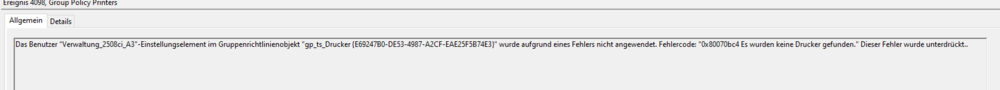 Guten Morgen @MurdocX nein der / die Drucker haben die ganze Zeit sauber funktioniert und konnten auch immer per GPO bereitgestellt werden. Ich habe die Treiber der Drucker schon getauscht aber das hat alles kein Erfolg gebracht. Was ich auch nicht verstehe ist wieso ich den Drucker 2508ci über die Freigabe nicht Installieren kann obwohl ich als Administrator angemeldet bin. Mit der Fehlermeldung 0x80070bc4 komme ich absolut nicht weiter. Sorry das ich einen anderen Drucker aus dem Event log genommen habe aber das ist die gleiche Fehlermeldung. Ich habe den Utax Drucker auf den PrintServer mehrfach mit anderen Einstellungen bereitgestellt.