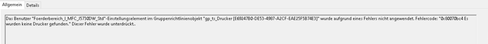 15. Guten Morgen @MurdocX nein der / die Drucker haben die ganze Zeit sauber funktioniert und konnten auch immer per GPO bereitgestellt werden. Ich habe die Treiber der Drucker schon getauscht aber das hat alles kein Erfolg gebracht. Was ich auch nicht verstehe ist wieso ich den Drucker 2508ci über die Freigabe nicht Installieren kann obwohl ich als Administrator angemeldet bin. Mit der Fehlermeldung 0x80070bc4 komme ich absolut nicht weiter. Sorry das ich einen anderen Drucker aus dem Event log genommen habe aber das ist die gleiche Fehlermeldung. Ich habe den Utax Drucker auf den PrintServer mehrfach mit anderen Einstellungen bereitgestellt.