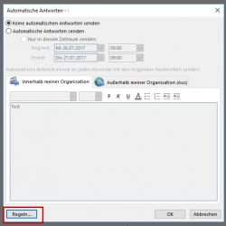 Hallo miteinander, aktuell stehe ich vor folgendem Problem und auch mein Freund Google hat mir nur bedingt weiter geholfen: Ein Anwender hat eine immer wiederkehrende "Abwesenheitsnotitz"... Ich habe schon seine Outlook-Regeln überprüft (Get-InboxRule -Mailbox EMAILADRESSE) und auch seinen Abwesenheitsassistenten - was etwas unsinnig ist, da dieser nur einmalig die Abwesenheitsnotitz verschickt (Get-Mailbox EMAILADRESSE | Get-MailboxAutoReplyConfiguration | fl). Nun ist mir aber bei mir im Abwesenheitsassistenten (Benutzer-seitig) ein weiterer Button aufgefallen: Leider hat Google und auch bisher kein TechNet-Eintrag bzw. das Exchange-Buch mir genaue Informationen hinsichtlich einer Script-basierten Lösung geboten, wie ich diese Parameter / Einstellungen im Abwesenheitsassistenten abfragen kann. Es handelt sich hierbei um separate Regeln für den Abwesenheitsassistenten... Auch der Befehl Get-MailboxAutoReplyConfiguration erweist sich hier als nicht sehr viel hilfreich. Hat einer von euch da noch einen Trick übrig das auf Powershell / Exchange-Shell umzusetzen ist? Danke im Voraus! Grüße -maDDin- -