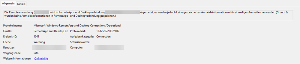 3. Ich habe noch mal ein wenig im Eventlog gewühlt und folgende Events gefunden: gefolgt von: Für Google und die Nachwelt: EventID 1042 und Fehler: 0x800700B7 Fehler beim Starten der Remoteanwendung ("RemoteApp") in RemoteApp- und Desktopverbindung ("Sessionbroker"). (Fehler: 0x800700B7) EventID 1041 Die Remoteanwendung ("RemoteApp") wird in RemoteApp- und Desktopverbindung ("Sessionbroker") gestartet, es werden jedoch keine gespeicherten Anmeldeinformationen für einmaliges Anmelden verwendet. (Grund: Es wurden keine Anmeldeinformationen in RemoteApp- und Desktopverbindung gespeichert.)