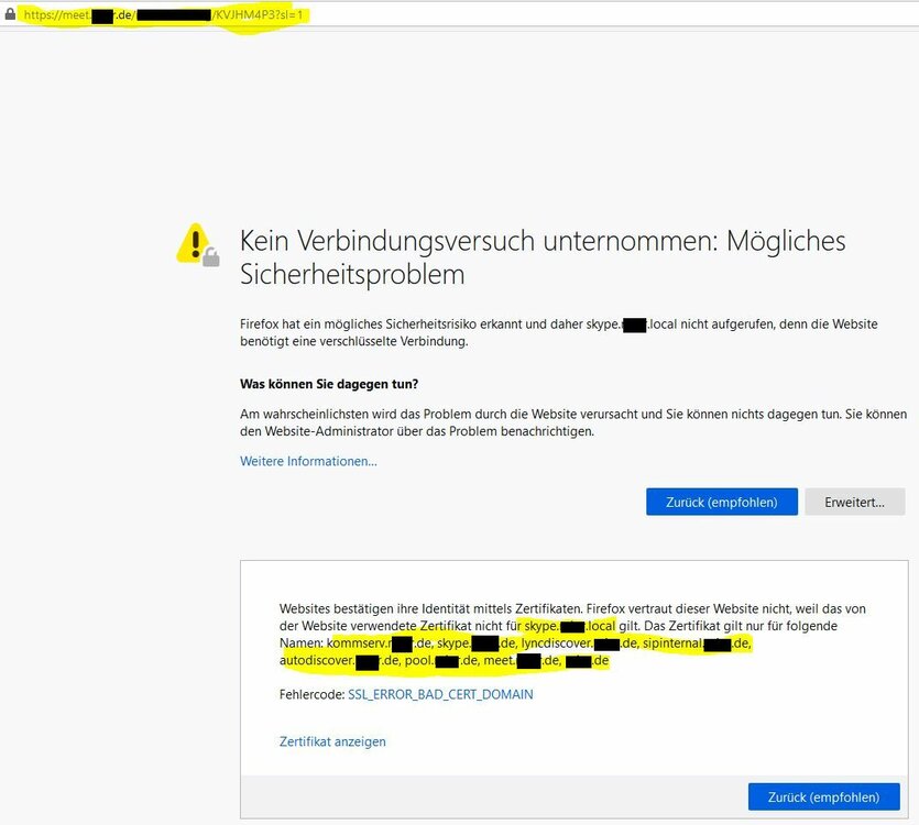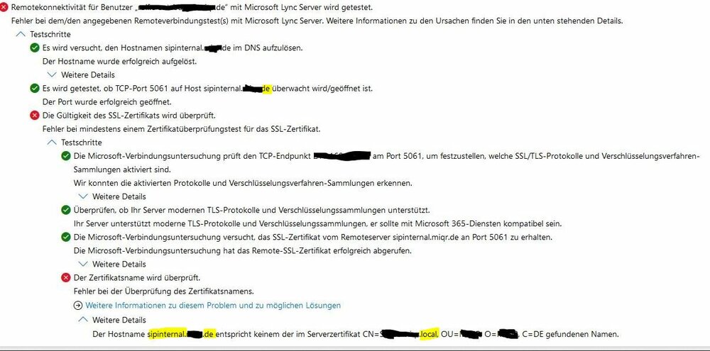 Da wir Skype for Business Server brauchen ( auch wenn es vermeintlich tot ist durch Teams) So hoffe ich doch das es noch jemand gibt der Lync/SFB 2015 oder 2019 nutzt oder vielseitig im Einsatz hat. Zur Situation: Strato Host, auf dem SFB 2019 läuft und per VPN ins Netz kommt. Ist der Domäne (.local) zugehörig. Hat eine öffentlich IP, und wir mit Skype.contoso.de/Lyncdiscover.contoso.de usw aufgelöst wird. Im Anhang der Testconnectivity Test. Sobald ich einen Client außerhalb der Domäne oder das WebApp nutzen will extern. zeit er einen Zertifikatsfehler an/ bzw in der WEB App versucht er die interne Adresse anzusprechen anstatt die Externe ( local) statt (de) Am IIS ist sowohl intern als auch extern das öffentliche Certum Zertifikat gebunden. Im Deployment Wizard unter Zertifikate ist zeigt alles auf das externe Zertifikat, ausser Serverstandard und interne Webdienste. Habe da aber auch schon die Unterschiedlichsten Varianten ausprobiert. Vielleicht finde ich ja über diese Thema hierüber Hilfe und wäre natürlich sehr dankbar. Bilder zur Konfig wie beschrieben im Anhang. ( Testconnectivity, IIS/ Client Konfig intern ) -