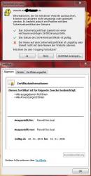 Hallo zusammen, heute haben wir wieder einen alten nervigen Fehler: Beim starten von Outlook kommt immer eine Sicherheitswarnung: Das Zertifikat unserer Firewall ist nicht vertrauenswürdig: Wir hatten das Problem schon mal, damals lag es daran, dass als 2. DNS Server die Firewall eingetragen wurde. Daher haben wir nur unseren SBS als DNS angegeben und die Meldung kam nie wieder. Man kann das Zertifikat so oft installieren wie man will, es kommt bei jedem start von Outlook, ansonsten wird diese Meldung nirgends angezeigt. Was mich wundert: Als "Website" wird unser SBS Zertifikat angegeben, allerdings will die Firewall (firewall.foo.local) das Zertifikat ausstellen?! bei Securepoint hab ich das gefunden: http://support.securepoint.de/viewtopic.php?f=27&t=1989&p=7299#p7299 Hilft mir aber nicht weiter. Habe auch nicht wirklich Ahnung von Zertifikaten. Danke für eure Hilfe -