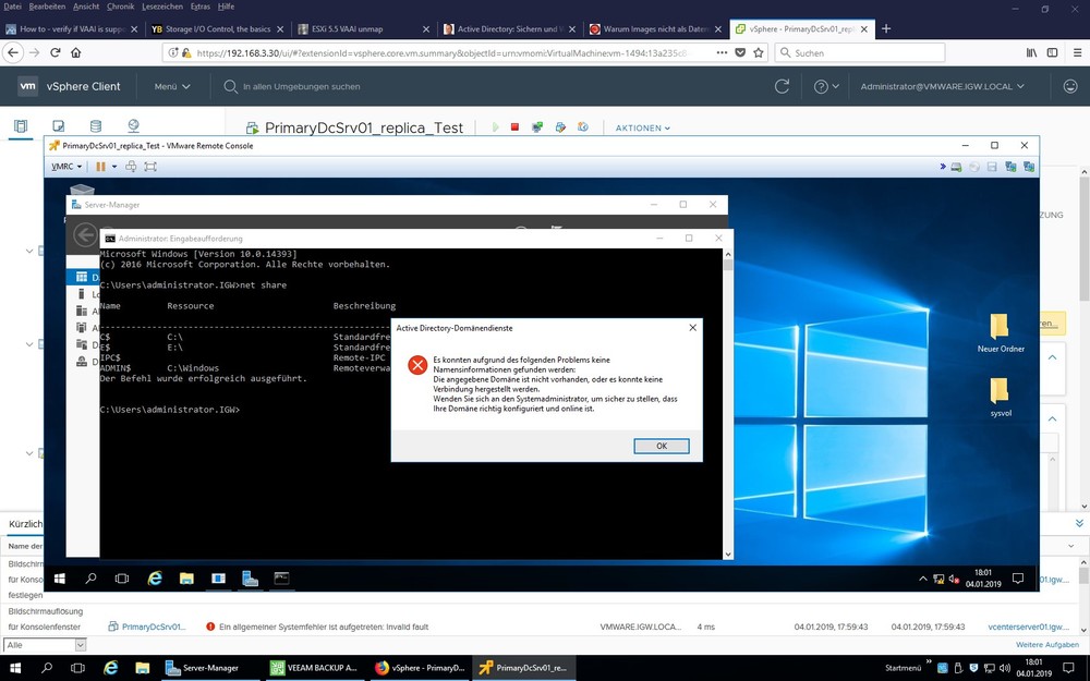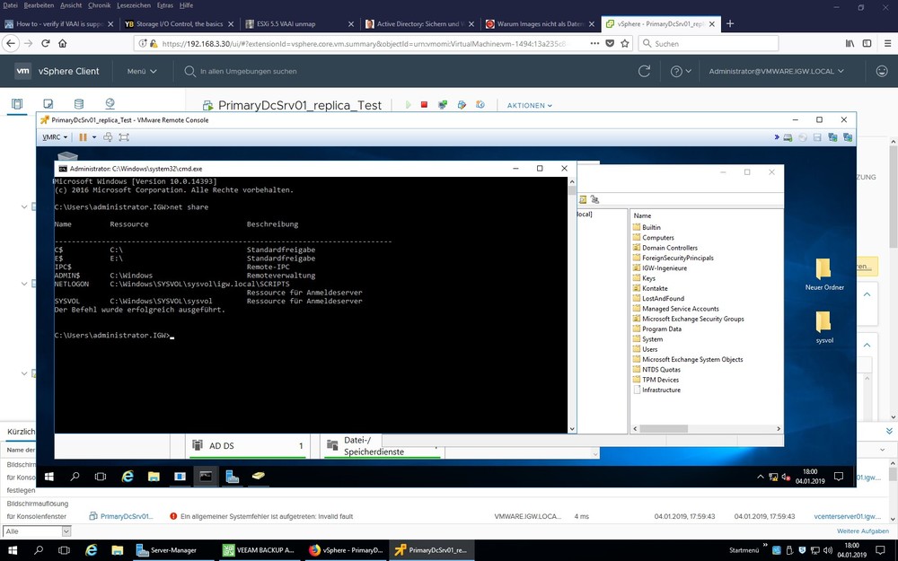 Hallo Miteinander zunächst noch ein gesundes neues Jahr an alle. Grund meines Themas ist das ich mich momentan mit der Thematik Disaster Recovery im AD Umfeld beschäftige. Ich habe jetzt schon einiges gelesen was das Thema Rücksicherung eines DCs angeht , vorallem das was man nicht machen soll oder nur mit vorsicht wegen USN (Snapshot usw...). Wir setzen bei uns im AD zwei Dcs mit WinServer2016 ein und diverser Memberserver Exchange, CAD usw... das ganze wird per VMware 6.7 Virtualisiert, die Sicherung fahren wir mit Veeam. Jetzt habe ich in unserer Firma ein zweites Vcenter aufgesetzt um dort einige Fälle im Falle des Falles aus zu probieren. Hier habe ich einen der beiden DCs aus einer Sicherung (eig. eher Veeam Replication) in diese geschottete Umgebung rückgesichert, jedoch stellt dieser DC ca. 5 min nach dem einschalten die AD dienste ein. Der Hintergrund ist das wohl VMware die Invocation ID mit dem Anschalten ändert und somit der DC weis das er aus einer Sicherung gestartet wurde und auf seine anderen "Kollegen" wartet das Sie ihm die aktuellen AD Daten replizieren (ich habe auch mit repadmin den Clone und das original verglichen, die Invocation ID ist anders). Jetzt gibt es ja nur den einen, weil wenn ich den anderen auch Rücksichere denkt der ja auch so. Im Eventlog steht auch in etwa das er kein AD von einem andern DC replizieren konnte. Gibt es hier einen Reg Key das man sagen kann er ist der DC wo die aktuelle Version des AD hält und seinen Betrieb wieder aufnimmt? Ebenso einmal die Frage, ich habe gelesen das wenn man ein USN verursacht dieser DC herabgestuft werden soll, läuft dann das AD wieder ganz normal weiter? Auch stand irgendwo das bei einem AD mit z.b 3 DCs und einer davon Rückgesichert wurde die anderen zwei ihre Dienste einstellen können, reicht es dann hier auch nur den Rückgesicherten herab zu stufen so das die beiden anderen wieder laufen? Ich frage deshalb um einfach das ganze besser verstehen zu können . Mfg Marcel