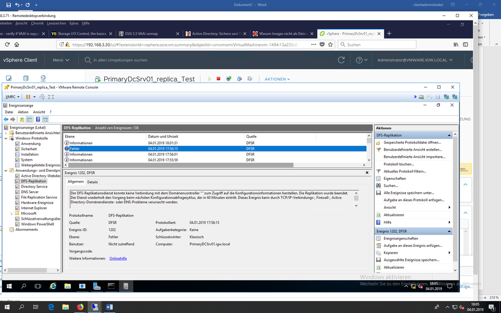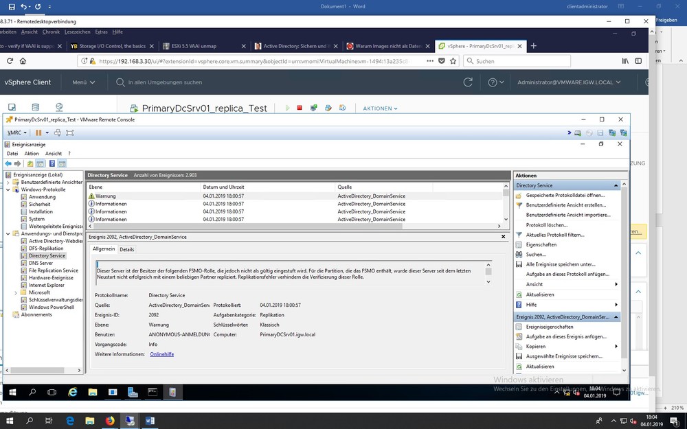 Guten Morgen Miteinander, also ich habe gestern Abend das ganze mal aufgezeichnet was genau passiert, im Anhang die Fotos. Der DC (DC1)wird rückgesichert (die Liveumgebung hat 2 Dcs einer davon hat alle FSMO Rollen diesen nenne ich mal DC1), sobald dieser hochgefahren ist kann man sich normal anmwlden und es scheint so als wäre alles OK das AD funktioniert und die Replikation des Sysvol auch. Wenn man jetzt aber ca. 3 Min wartet und nochmal in der cmd net Share aufruft ist das Sysvol und netlogon verschwunden, auch der Aufruf dsa.msc meldet einen Fehler (es konnte aufgrund des folgenden Problems keine Namensinformation gefunden werden , die angegebene Domäne ist nicht vorhanden...). Im Eventlog steht 2092 Server ist Besitzer der FSMO Rollen die jedoch nicht als Gültig eingestuft wird, Für die PÜartition wurde der Server seit dem letzten neustart nicht repliziert.... Im Eventlog steht 1202 Der DFS Replikationsdienst konnte keine Verbindung mit dem Domänencontroller "" zum zugrif auf die Konfigurationspartition herstellen. Was ich nicht ganz verstehe sind die Sysvol Replikation und die des AD zwei paar Schuhe oder nicht, weil wenn man diese Bur Flag setzt läuft ca. 4 min später wieder alles. Das Bur Flag 0xd4 sagt doch aber nur was über das Sysvol aus das der DC hier der Authorative ist und sein Sysvol Verzeichnis "das sagen hat", oder nicht? Auch habe ich mal KEY_LOCAL_MACHINE\System\CurrentControlSet\Services\DFSR\Parameters\SysVols\Migrating Sysvols\LocalState geprüft ob DFSR oder FRS zum Einsatz kommt, das steht bei uns 0 im Key, das wäre dann das ältere FRS ? Im Voraus schonmal Recht vielen Dank der Hilfe P.s bei den Bildern ist Foto 1 direkt nach dem start und 2-4 ca. 3 Min später Grüße Marcel -