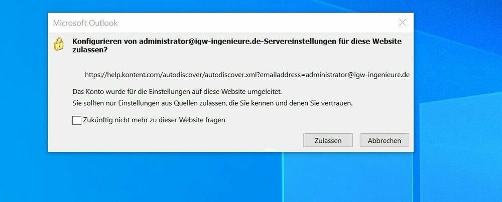 Hallo Miteinander, bei uns kommt in letzter Zeit immer die Meldung ob man Konfigurationen für eine Website zulassen möchte. Dies kommt immer bei den Clients (Outlook 2016) wo im Exchange Vollzugriff auf ein weiteres Postfach besteht. AUf dem Bild erkennt man es, ich habe noch das adminpsotfach mir hinzugefügt im Exchange (also Vollzugriff auf das Konto) und für dieses Konto kommt auch immer die Meldung. Das ganze war plötzlich da, vorher ist das nie gekommen und kommt für mein Konto nicht. Gefühlt kommt das einmal die Std. so wie glaube die Autodiscover abfragen sind. Ich kenne das ganze nur wenn Outlook nach dem Server per Autodiscovber sucht. Das Konto wird aber ganz normal in meinem Outlook neben meinem Postfach angezeigt. Weis da einer warum das kommt? Grüße Marcel -