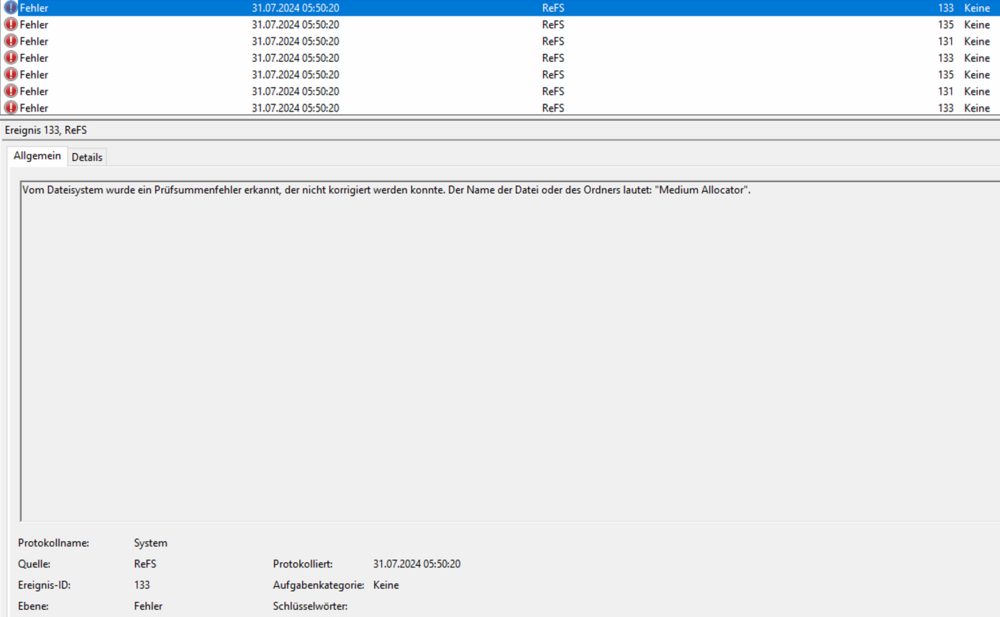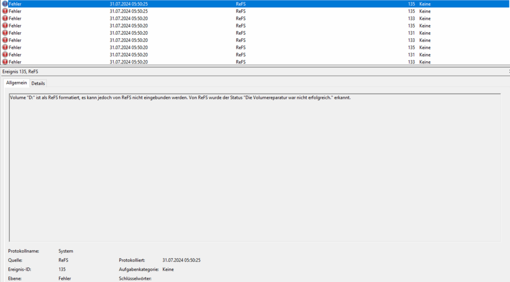 Es wurden in diesem Fall keine Patches installiert ... das es hier mal Probleme gab mit Updates konnte ich durch etwas Recherche auch in Erfahrung bringen. Das REFS Volume war nach einem Neustart einfach nicht mehr zugreifbar (als RAW Basisdatenpartition angezeigt). Im Anhang Screenshots aus dem Eventlog, in 12 Jahren habe ich das so noch nicht erlebt ... Lösung: Habe zwar - trotz eingelegter Nachtschicht - keinen Weg gefunden, dieses Volume ohne Formatierung wieder nutzen zu können. Jedoch konnte ich alle für uns wichtigen Daten aus diesem RAW Volume wiederherstellen. Dafür kam ein Bordmittel zum Einsatz, welches scheinbar nicht wirklich oft genutzt bzw. nur sehr sehr selten beschrieben wird: REFSUTIL Durch den "Vollständigen automatischen Modus: refsutil salvage -FA <source volume> <working directory> <target directory>" konnten alle Dateien (in diesem Fall *.vhdx) aus dem RAW Volume auf ein Netzlaufwerk wiederhergestellt werden. Es hätte hier natürlich auch ein Backup gegeben, welches jedoch den Verlust von ca. 24h an Daten zur Folge gehabt hätte. -