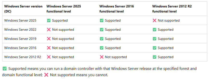Moin, "unbekannt" bedeutet wohl, dass Du es mit einer Version von (was auch immer Du benutzt) abfragst, die älter ist als 2025. Frühere RSAT-Versionen kennen den FL 10 (=2025) tatsächlich nicht. "laut Microsoft" , also in der offiziellen Dokumentation (https://learn.microsoft.com/en-us/windows-server/identity/ad-ds/active-directory-functional-levels) <-- siehst Du, wie einfach das geht? sieht es so aus: