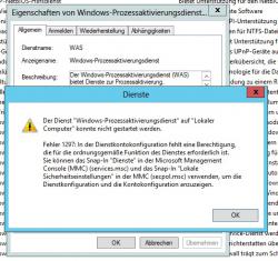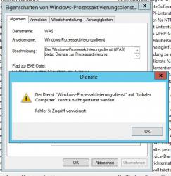Das Hauptproblem liegt darin, dass ich den WAS-Dienst nicht starten kann, versuche ich ihn manuell zu starten, bekomme ich die Fehlermeldung, dass der Zugriff verweigert wird (siehe Bild 1), trage ich im Dienst den Administrator zum starten ein, kommt ein anderer Fehler (siehe Bild 2). Starten man den Dienst mit normalen Einstellungen, wie in Bild 1, tauchen in der Ereignisanzeige zwei verschiedene Ereignis-IDs auf: "Der Konfigurations-Manager für den Windows-Prozessaktivierungsdienst (WAS) wurde nicht initialisiert." (5036)  und "Der Windows-Prozessaktivierungsdienst (WAS) wird aufgrund eines Fehlers angehalten." (5005).