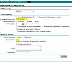 4. Hallo, Wie man oben schon lesen kann, habe ich ein paar Probleme beim Zertifikate erstellen. Ich habe schon selbst im Internet gesucht, aber leider erfolglos, deswegen erhoffe ich mir hier jemanden zu finden, der mir weiter helfen kann. Also jetzt zum Problem: Immer wenn ich auf die Seite http://servername/certsrv/ gehe und mir ein Zertifikat anfordern lassen willl, wird mir Gefühlt nur die Hälfte angezeigt und manche Auswahlmöglichkeiten werden einfach nicht geladen. (Wie man im Anhang sehen kann) Immer wenn ich das ausfülle, was ich ausfüllen kann dann kommt eine Meldung, dass der Vorgang fehlgeschlagen ist. Danke jetzt schon mal für die Antworten. Gruß Ziralo