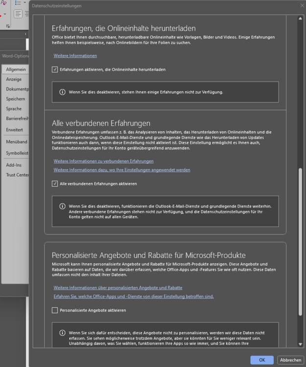 Soweit so gut. Dann habe ich ein paar Tage später im SharePoint - Online eine Datei geöffnet und wollte die in meinem lokalen Excel bearbeiten. Das ging nicht mehr. Ich musste die beiden Haken wieder setzen um in sharepoint.com Dateien in meinen lokalen installieren Word und Excel Programmen öffnen zu können. Mit dem geht einher, dass ich nun wieder die Meldung im Outlook bekomme und die mit dem X in der Ecke wegklicke worauf sich dann die Verbindung zum Exchange verabschiedet.