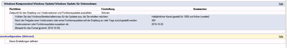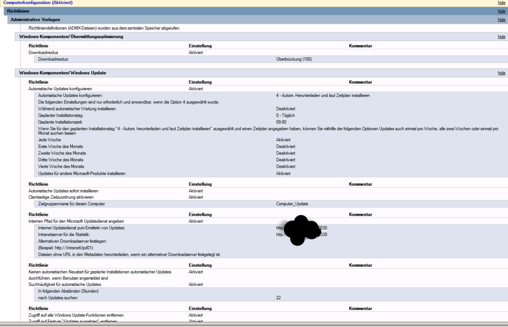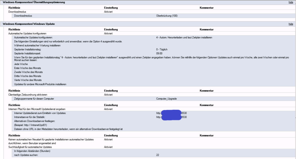 Hallo Zusammen, ich brauche mal Hilfe beim WSUS, da ich einfach nicht schlau werde aus den Einstellungen. Ich versuche in einer Umgebung eine Update und eine Upgrade Gruppe zu betreiben, um gezielt Rechner mit Updates oder auch mal Windows Upgrades 1909, 2004 etc zu versorgen. Die Gruppenrichtlinen sind durch Sicherheitsfilter auf bestimmte PCs festgelegt und das klappt auch alles soweit - die Einstellungen der GPOs sind unten zu sehen. Was ich nun nicht verstehe ist, sobald ich den Download Modus auf LAN stelle oder komplett weg lasse ist es scheinbar egal in welcher Gruppe ein Rechner ist oder welche GPO er bekommt oder ob das Upgrade für den PC freigegeben ist, er holt sich einfach das, was er sich nicht holen soll. Z.b bekommt ein Rechner in der Gruppe UPDATE dann aufeinmal UPGRADES auf 2004. Was mache ich falsch? Wie kann ich es erreichen, dass wirklich nur PCs für die das Upgrade freigeschalten ist dieses auch bekommen? Dazu verwende ich folgende Einstellungen für Update: Für Upgrade: -