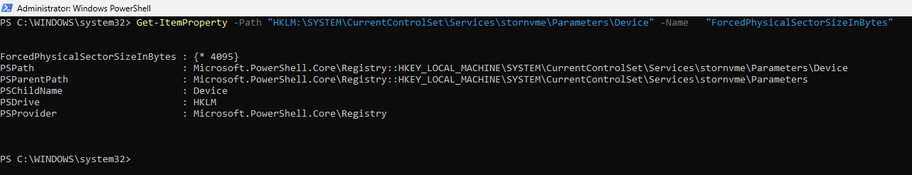 Hallo zusammen, wir versuchen aktuell einen MSSQL Server 2022 oder 2025 unter Windows 1125H2 zum laufen zu bekommen. Bei der Installation stoßen wir auf das bekannte Windows 11 + NVME Problem hinsichtlich SQL Installation. Ich konnte auch schon verifizieren, dass es sich um das spezifische Problem handelt, da sich in der Error Log genau der angesprochene Passus findet: There have been 256 misaligned log IOs which required falling back to synchronous IO. The current IO is on file C:\Program Files\Microsoft SQL Server\MSSQL17.XXXX\MSSQL\Template Data\master.mdf. Das hinzufügen des Reisgtry Eintrages habe ich ebenfalls schon hinter mir (mit Neustart). Dieser wurde auch korrekt gesetzt. Fsutils zeigt folgendes: C:\Users\Administrator>fsutil fsinfo sectorinfo C: Logische Bytes pro Sektor: 512 Physische Bytes pro Sektor für Unteilbarkeit: 4096 Physische Bytes pro Sektor für Leistung: 32768 Effekt. phys. Bytes/Sektor für Unteilbark. in Dateisystem:4096 Geräteausrichtung: Nicht ausgerichtet (0x1000) Partitionsausrichtung auf Gerät: Nicht ausgerichtet (0x000) Kein Abzug für Suchen Kürzen wird unterstützt Nicht DAX-fähig Fehler 1: Unzulässige Funktion. Da es sich ohnehin um einen neuen Rechner handelt, habe ich die Windows 11 Installation testweise neu gemacht und dabei gleich den "neuen" NVME Treiber aktiviert. Leider ebenfalls ohne Ergebnis. Installation scheitert sowohl mit dem SQL Server 2022, als auch mit 2025. Jemand einen Tipp für mich, wie ich die SQL Instanz zum laufen bekomme? Grüße und Danke!