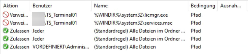 Hallo zusammen, ich versuche aktuell in unserer Testumgebung etwas in die Thematik Applocker rein zu kommen. Allerdings bekomme ich das ganze nicht wirklich zum laufen. Zum aktuellen Test-Aufbau: - DC (Windows Server 2022, AD Ebene 2016) - Terminalserver (Server 2022 Datacenter) Aufgebaut habe ich das System nach dieser Anleitung. Soweit ich das nachvollziehen kann, auch erfolgreich (Dienst Anwendungsintegrität läuft auch, Regeln sind erzwungen). Als ersten Versuch habe ich versucht, die Benutzer aus der Windows Dienstverwaltung und dem RDS Lizenzierungsmanager auszusperren: Die drei unteren Regeln sind die Standardregeln, die beim Anlagen der GPO erzeugt werden. In der AD Gruppe "TS_Terminal01" sind die User drin, die sich an dem TS anmelden dürfen (keine Admins). Nach meiner Auffassung dürften die Benutzer, welche Teil der Gruppe "TS_Terminal01" sind die beiden Anwendungen nicht mehr aufrufen. Allerdings können die Benutzer die Teil der Gruppe sind weiterhin beide Anwendungen aufrufen. Was mir noch aufgefallen ist, bei einem "gpresult" wird die Applocker GPO gar nicht angezeigt. Wo hab ich einen Denkfehler drin? Grüße!